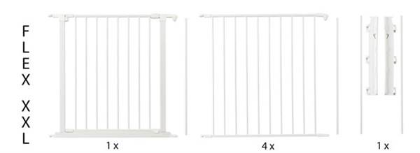 - FLEX XXL składa się z: otwieranej bramki (szerokość sekcji: 72 cm), 4 paneli szerokości 72 cm, mocowań do ściany.