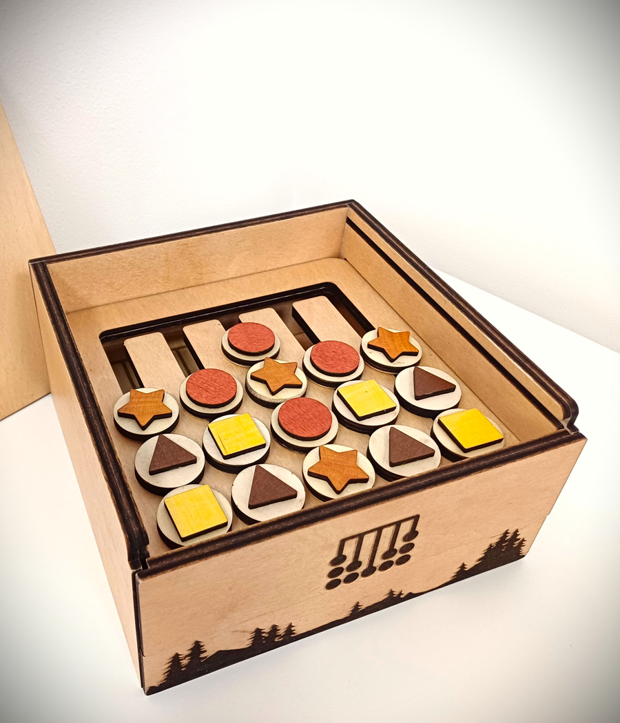 W tej zabawie musisz wykazać się sprytem, aby prawidłowo uporządkować kształty. Często trzeba przesunąć wiele elementów w konkretne miejsce, aby uwolnić pożądany kształt, co ćwiczy umiejętność przewidywania i planowania ruchów. Gra rozwija koncentrację i cierpliwość, a także pomaga w ćwiczeniu pamięci taktycznej. Dodatkowo, drewniana skrzynka, w której przechowywane są wszystkie elementy, sprawia, że zabawka jest estetyczna i poręczna – idealna do trzymania na półce.