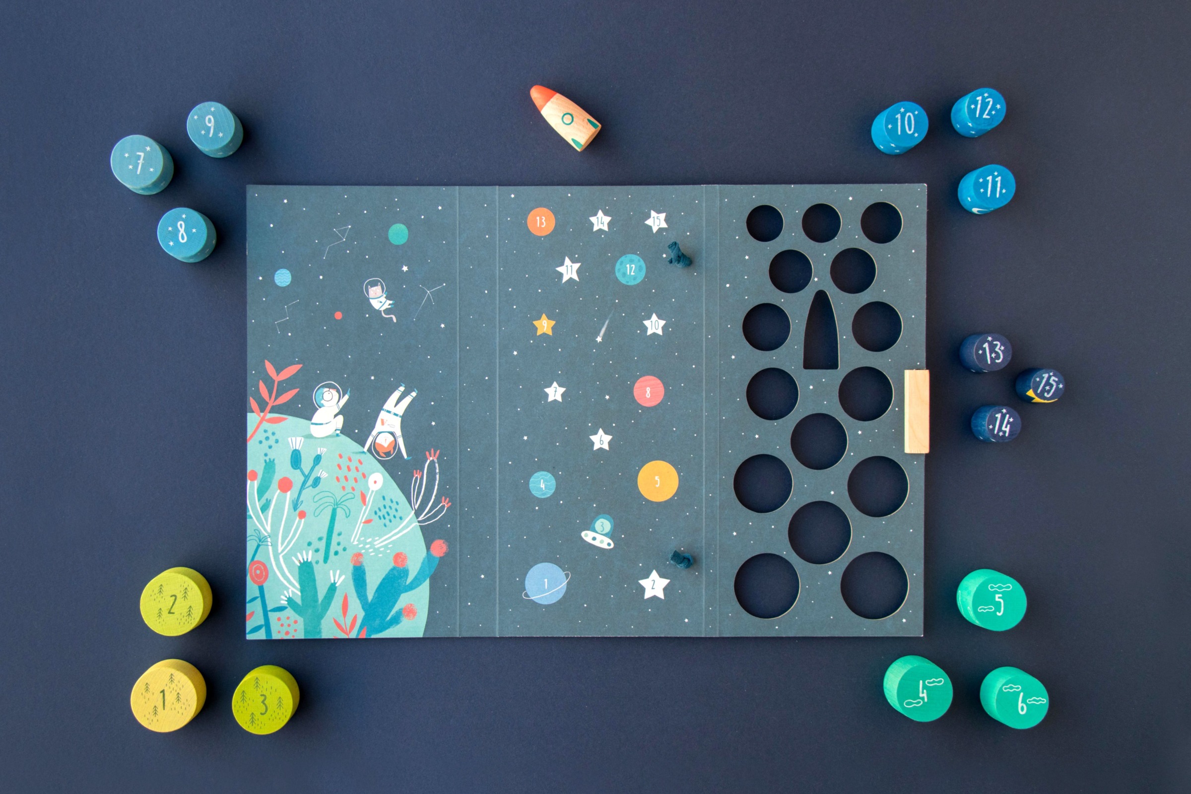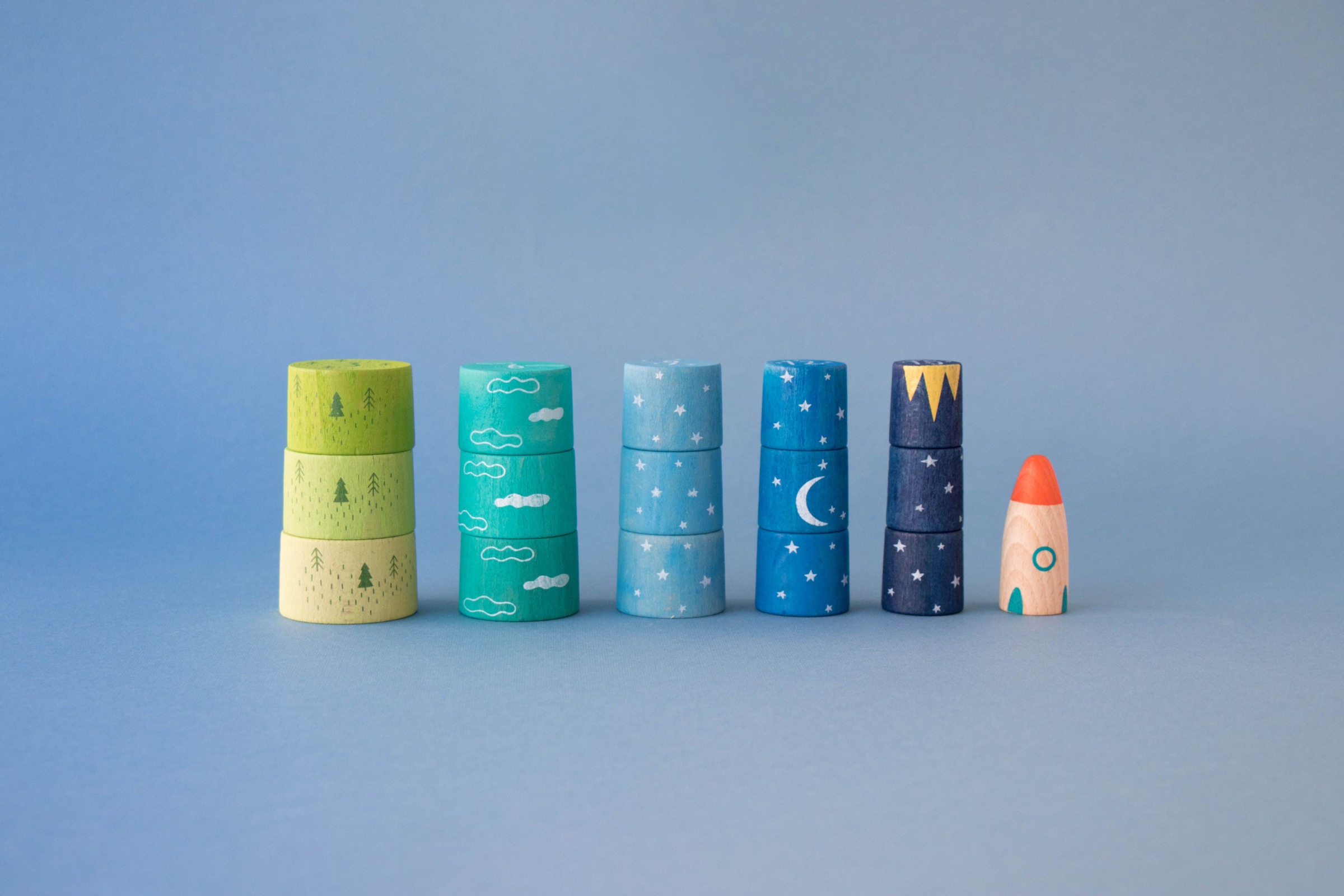 W zestawie znajduje się 16 kolorowych krążków, które utworzą kształt rakiety.