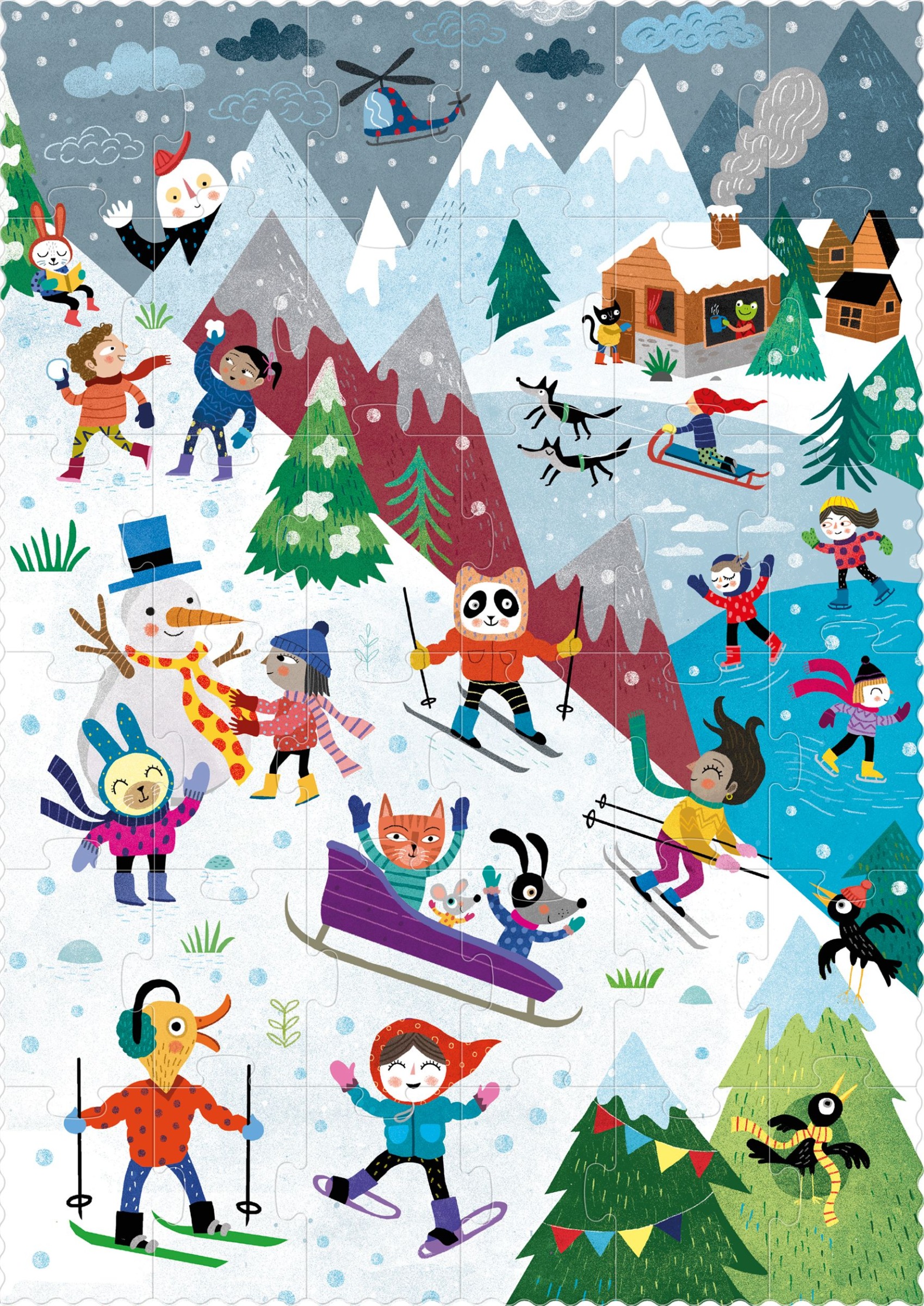 Piękne dwustronne puzzle, 34 elementowe, z jednej strony to zabawy w górach, w których tak dużo dzieje się kiedy jest lato, po drugiej stronie jest do ułożenia obrazek, z tym samym miejscem ale już z górskimi zabawami zimowymi.