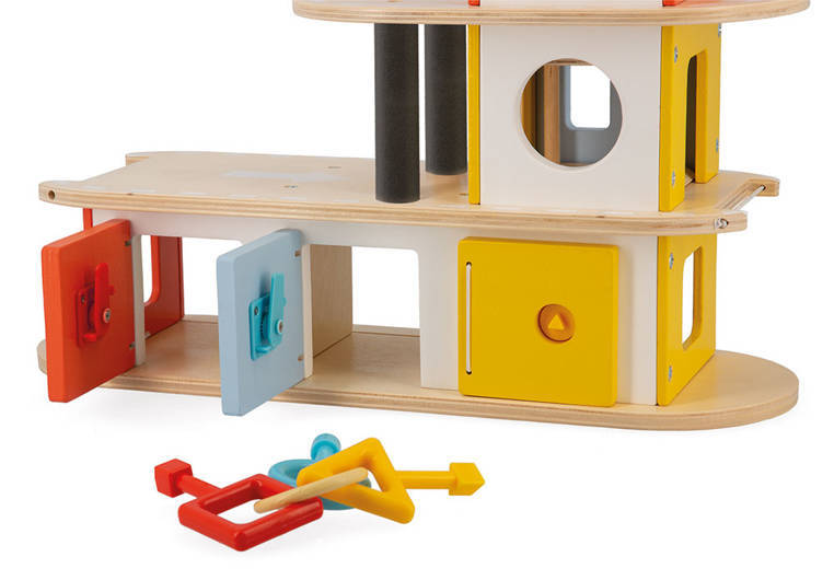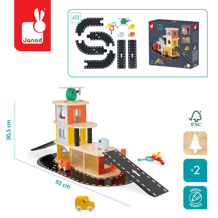Drewniany piętrowy garaż z serii Bolid francuskiej marki JANOD to idealny prezent dla każdego dziecka. Komplet składa się z kilkupoziomowego (3 kondygnacje!) garażu wraz z akcesoriami: 3 autami i helikopterem. Na najniższym piętrze znajdują się trzy boxy, otwierane dołączonymi do zestawu plastikowymi kluczykami o różnych kształtach geometrycznych (funkcja sortera). Budynek posiada dwa podjazdy, mechaniczną windę (na koło zębate) oraz lądowisko dla helikopterów. Zestaw pozwala na tworzenie wielu scenariuszy zabaw. Zabawka została zaprojektowana we Francji. Idealnie nadaje się na prezent.