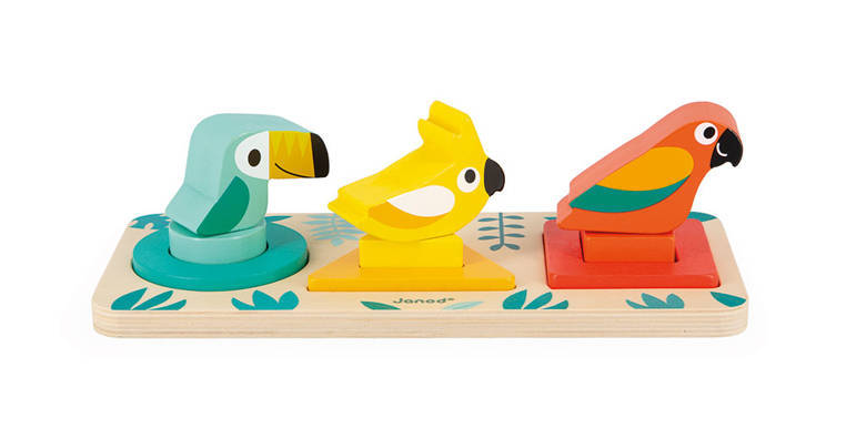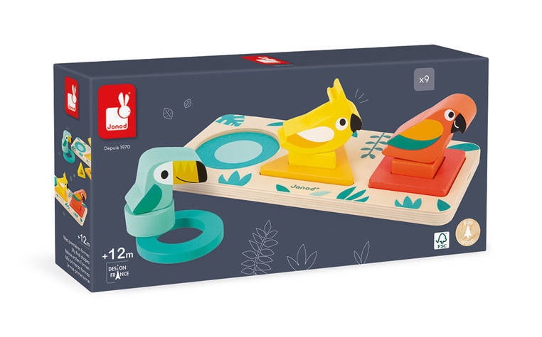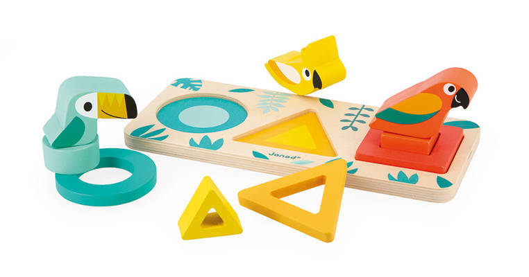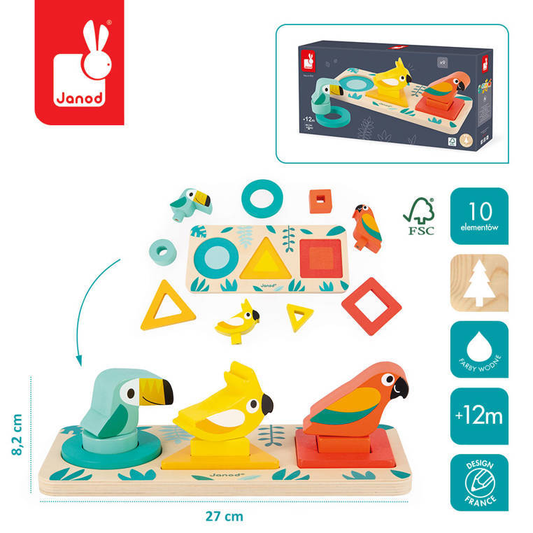 Drewniany sorter Pierwsze kształty z serii Tropik francuskiej marki JANOD rozwija u dziecka wiele kluczowych umiejętności, m.in. rozróżnianie i dopasowywanie kształtów i kolorów oraz tzw. małą motorykę, ponadto uczy koncentracji, spostrzegawczości i cierpliwości. W drewnianej planszy z bezpiecznymi, zaokrąglonymi rogami znajdują się trzy otwory na drewniane klocki w różnych geometrycznych kształtach – koło, kwadrat i trójkąt oraz kolorach – kolejno: turkusowym, żółtym i czerwono-pomarańczowym. W każdym otworze można umieścić w sumie po trzy elementy – dwa klocki – jeden większy i bardziej płaski, tworzący ramkę, drugi mniejszy i z mniejszym otworem, ale wyższy, pasujący w środek tej ramki oraz klocek w kształcie ptaszka na bolcu, pasującym do otworu w klocku poprzednim. Zabawka zachwyca estetyką wykonania i pięknymi, intensywnymi barwami.