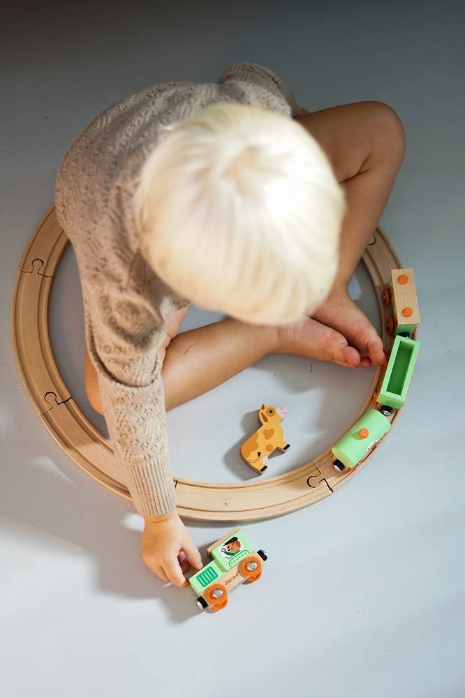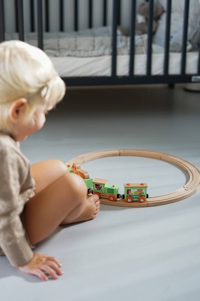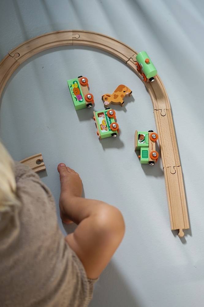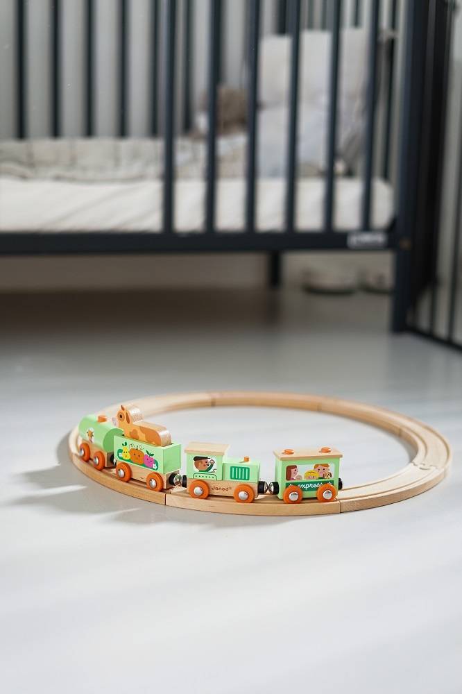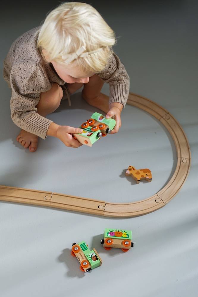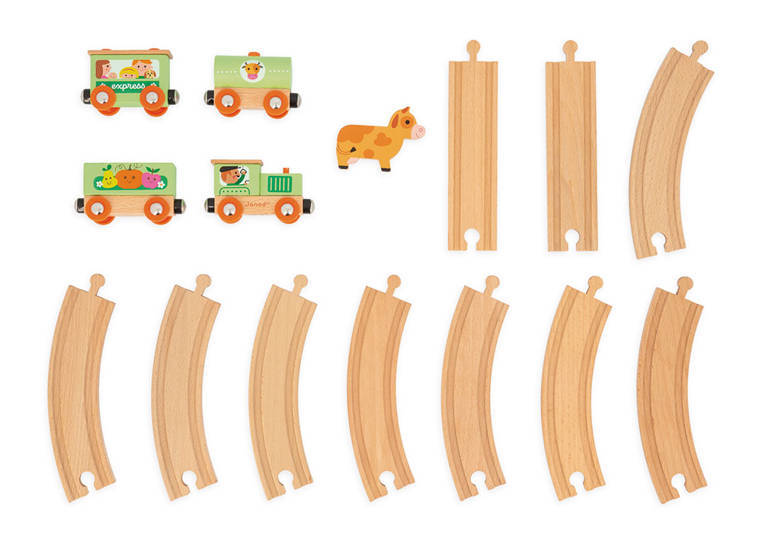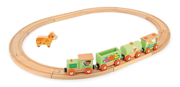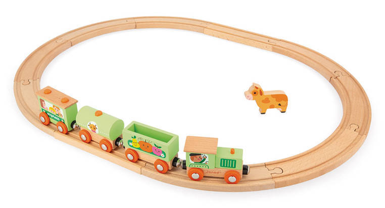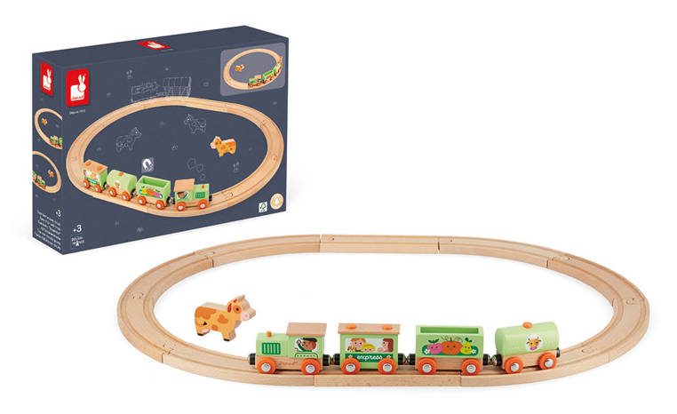 Pociąg drewniany Farma z serii Story francuskiej marki JANOD to idealny prezent dla każdego dziecka. Zestaw składa się z 10 torów, które połączone ze sobą tworzą owalną trasę dla pociągu oraz 4 wagonów, łączonych między sobą na magnesy: lokomotywy, cysterny, wagonu osobowego oraz wagonika z figurką krówki. Kolejka jest perfekcyjnie wykonana, utrzymana w odcieniach pastelowej zieleni i jasnego drewna. Zestaw łączy się z innymi z serii Story oraz podobnymi zestawami innych marek. Również sam w sobie pozwala na tworzenie wielu scenariuszy zabaw z farmą w roli głównej.