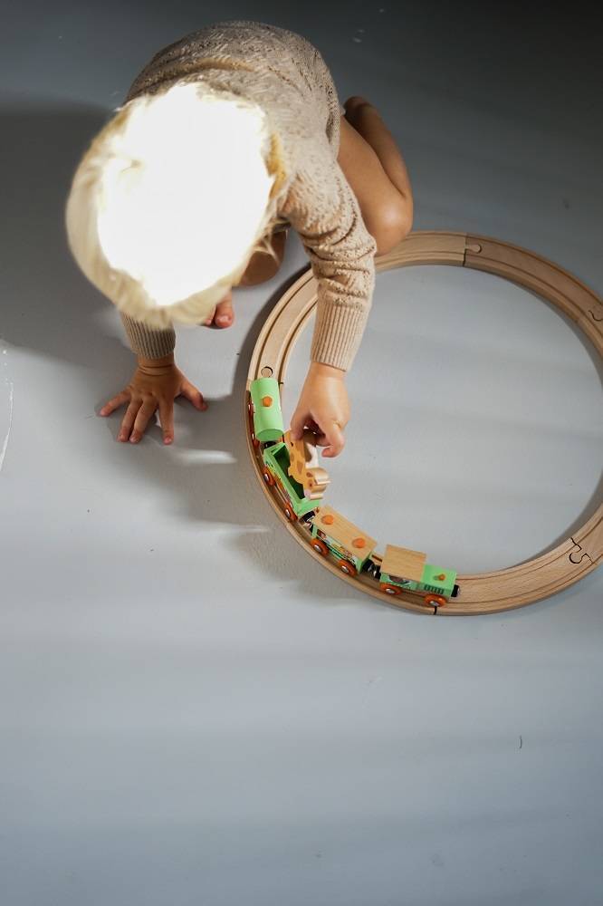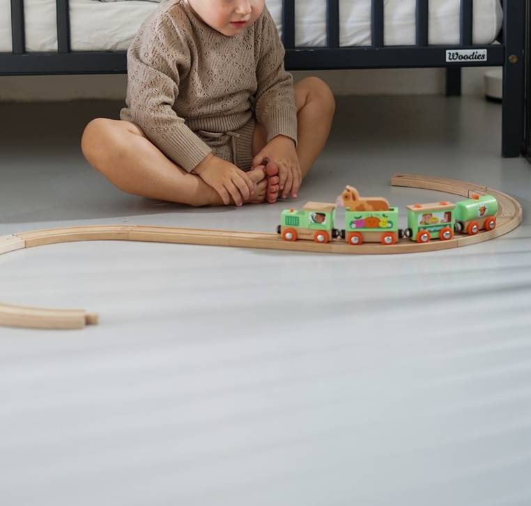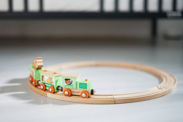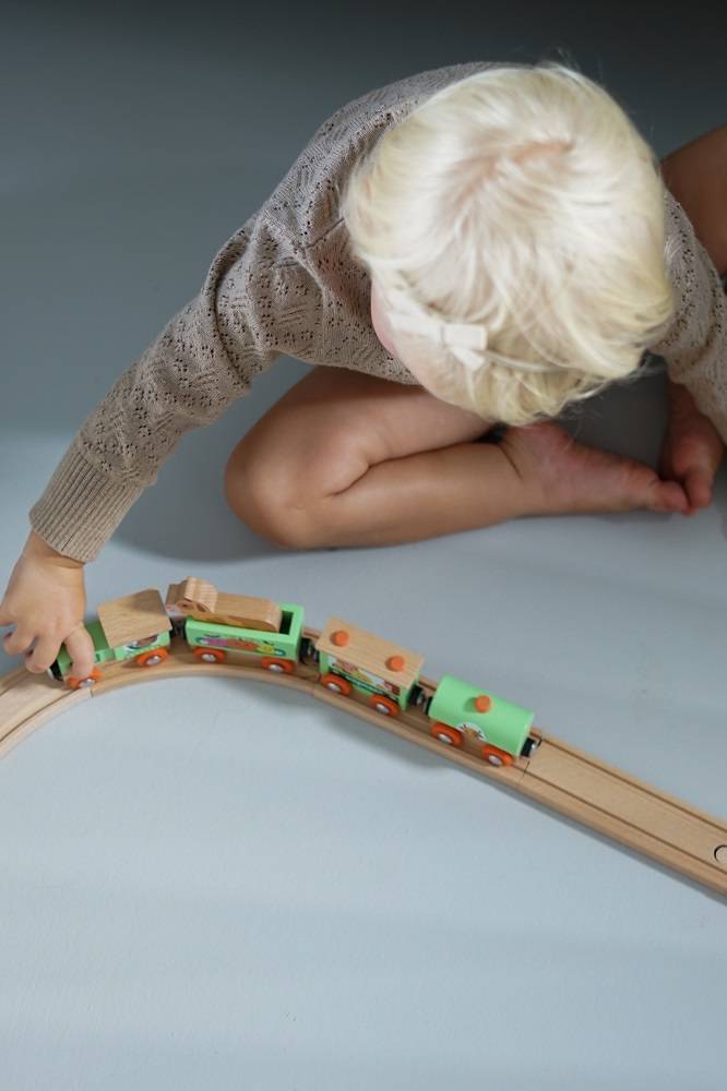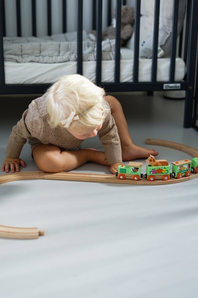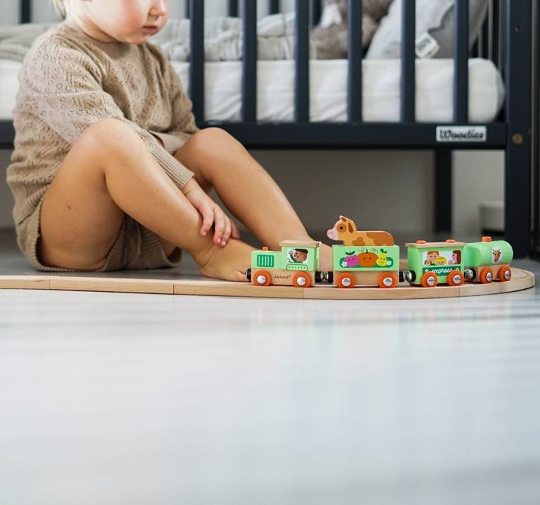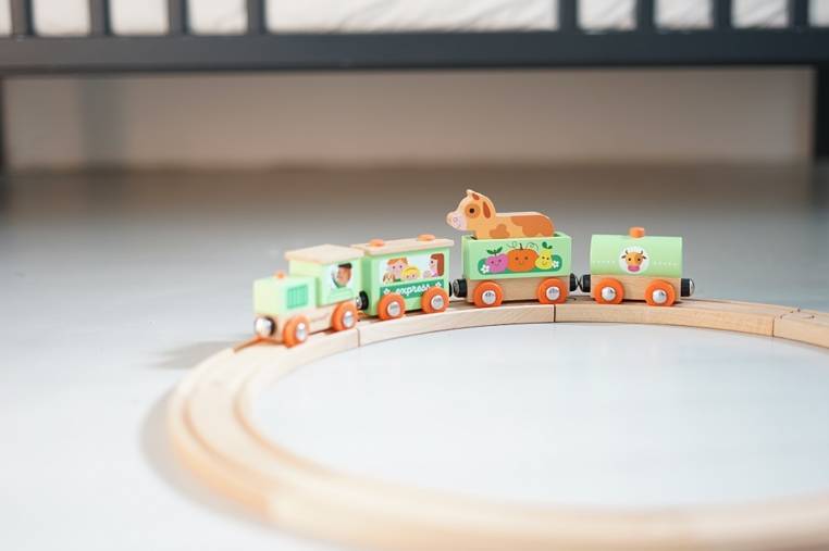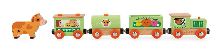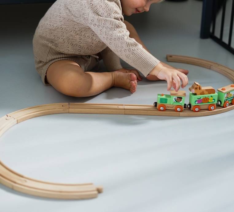 Pociąg drewniany Farma z serii Story francuskiej marki JANOD to idealny prezent dla każdego dziecka. Zestaw składa się z 10 torów, które połączone ze sobą tworzą owalną trasę dla pociągu oraz 4 wagonów, łączonych między sobą na magnesy: lokomotywy, cysterny, wagonu osobowego oraz wagonika z figurką krówki. Kolejka jest perfekcyjnie wykonana, utrzymana w odcieniach pastelowej zieleni i jasnego drewna. Zestaw łączy się z innymi z serii Story oraz podobnymi zestawami innych marek. Również sam w sobie pozwala na tworzenie wielu scenariuszy zabaw z farmą w roli głównej.
