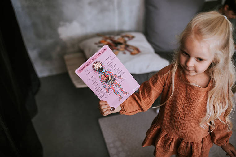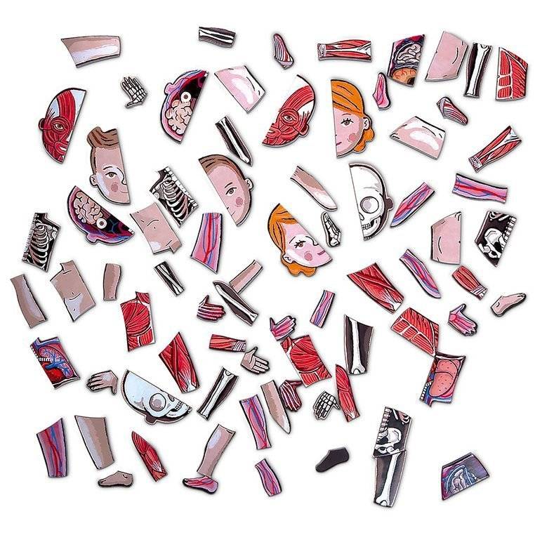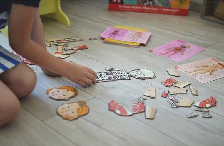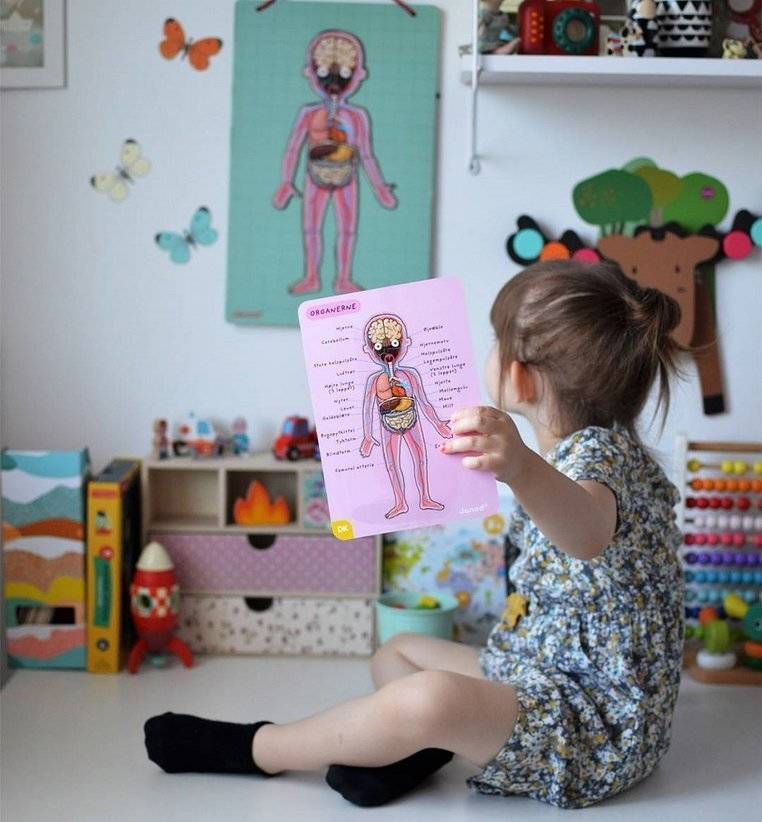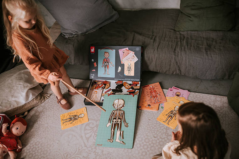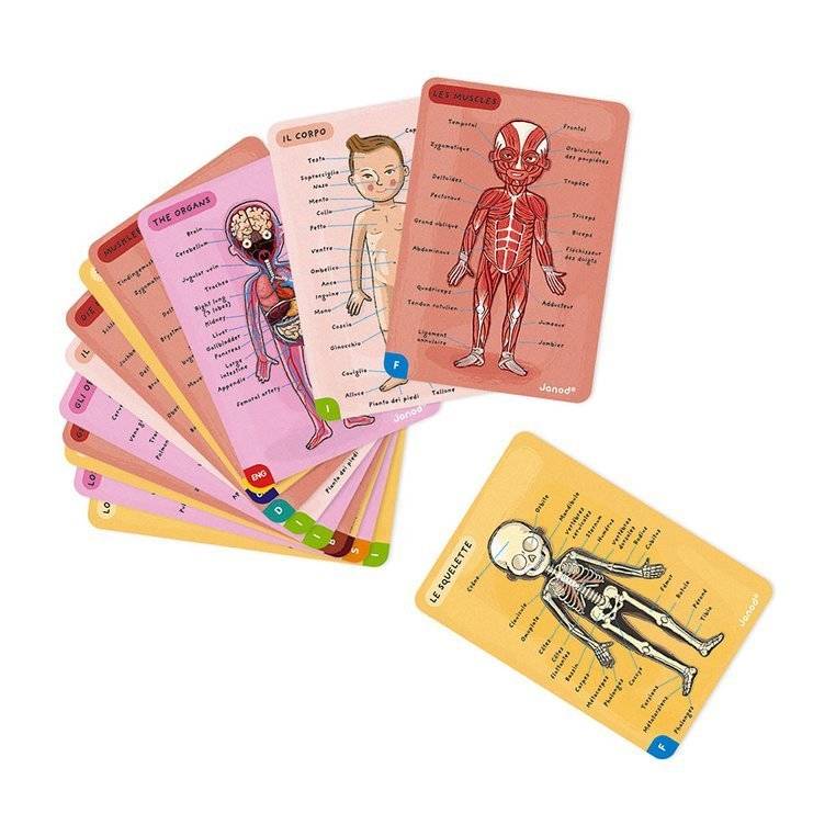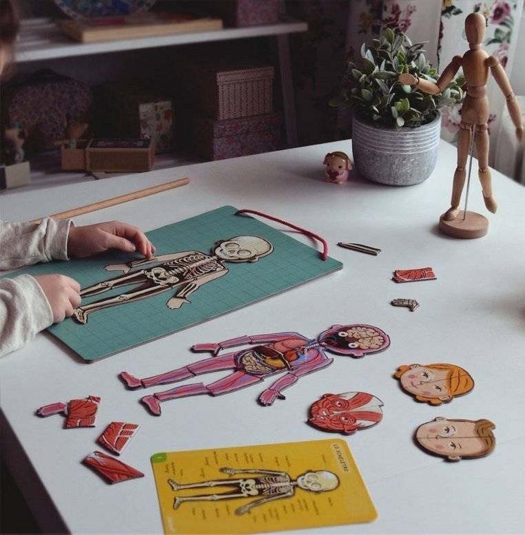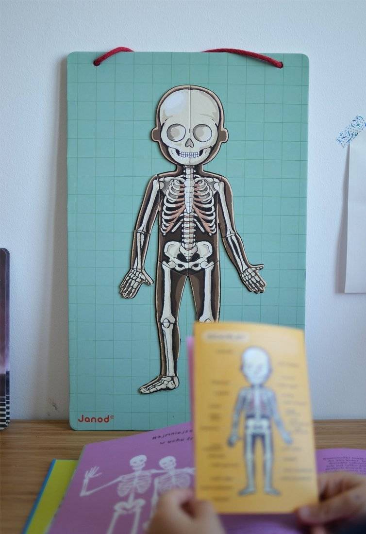 Układanka magnetyczna Ciało Człowieka francuskiej marki Janod to układanka edukacyjna, która nauczy Twoje dziecko budowy ludzkiego ciała w 11 językach (m.in. angielskim, niemieckim, włoskim i hiszpańskim). Dzięki grze dziecko pozna nazwy części ciała, organów, kości i mięśni. Zestaw zawiera: magnetyczną tablicę, 18 kart pomocniczych z zaznaczonymi częściami ciała w różnych językach, 76 magnetycznych elementów ciała oraz drewniany wskaźnik.