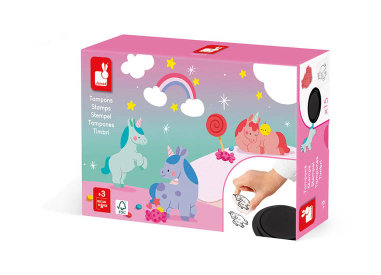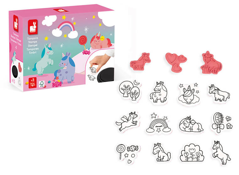 Zestaw kreatywny Stempelki Jednorożce francuskiej marki JANOD zawiera 15 poręcznych stempelków o różnych kształtach z uroczymi grafikami, m. in. magicznymi jednorożcami i elementami ich bajkowego świata, jak błyskotki i słodycze. Z ich pomocą można ozdabiać wybrane powierzchnie, tworzyć niepowtarzalne historie, a odbite obrazki – dodatkowo pokolorować. Stempelki wykonane są z przyjemniej w dotyku sprężystej pianki i gumowej powierzchni, na której umieszczony jest obrazek do odciskania. W komplecie znajduje się też poduszeczka z czarnym tuszem. Stemplowanie to dla dziecka wiele długich chwil angażującej i jednocześnie uspokajającej zabawy.