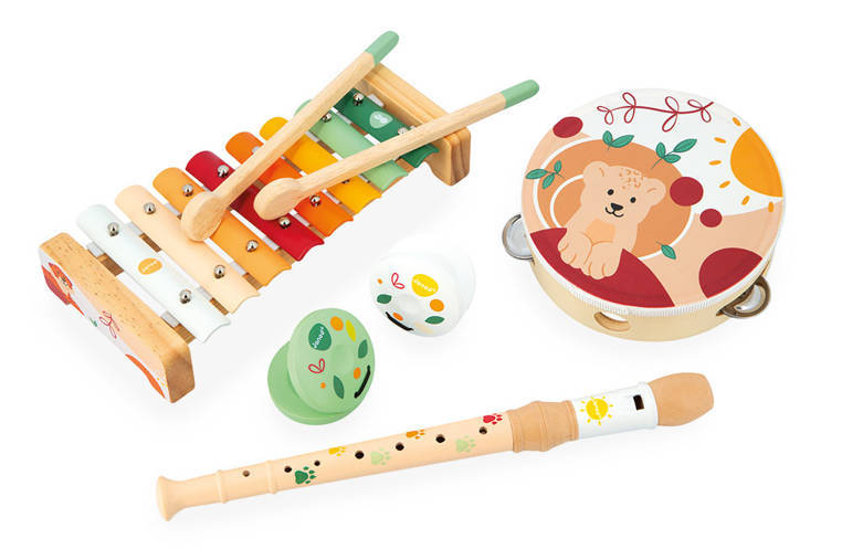 Zestaw zabawek muzycznych z serii Sunshine francuskiej marki JANOD to idealna pierwsza zabawka muzyczna dla dziecka, która pomaga rozwijać słuch, poczucie rytmu oraz zdolności muzyczne. Wspiera także rozwój wyobraźni, koncentracji, wytrwałości i koordynacji ruchowej. W skład zestawu wchodzą: ksylofon z ośmioma metalowymi klawiszami (8 tonów) i drewnianymi pałeczkami, kastaniety, flet i tamburyn. Każdy instrument brzmi inaczej, dzięki czemu dziecko będzie miało możliwość poznania wielu dźwięków, a także – dzięki ilości elementów – stworzenia z przyjaciółmi własnego zespołu. Zestaw wyróżnia piękna słoneczna kolorystyka – na tamburynie namalowany jest mały lewek Leo, flet zdobią odciski łap, a kastaniety – barwne motywy roślinne.