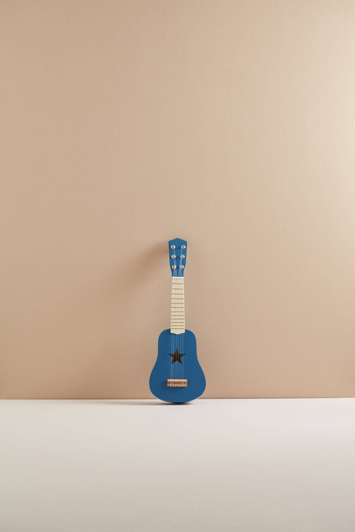 Drewniana gitara zabawkowa z wycięciem w kształcie gwiazdy.