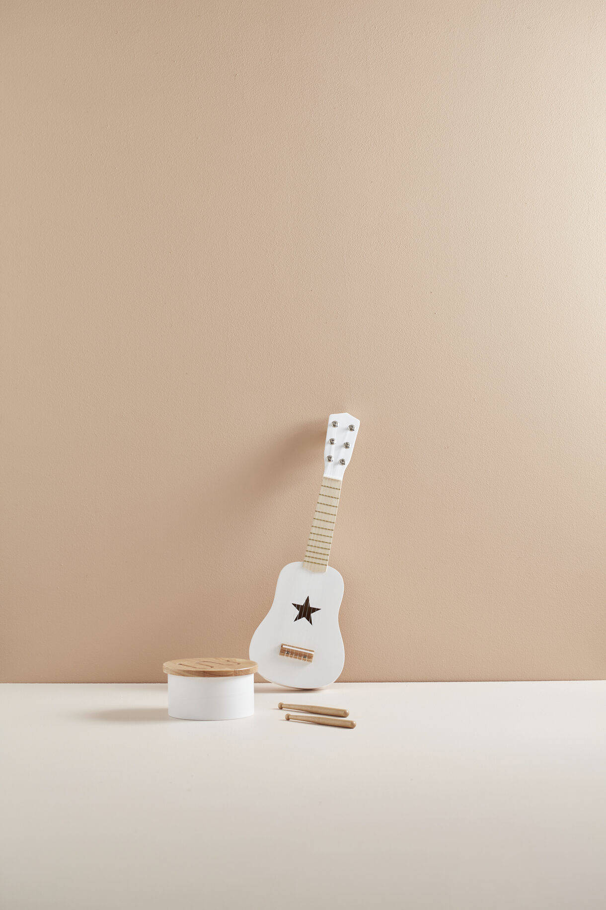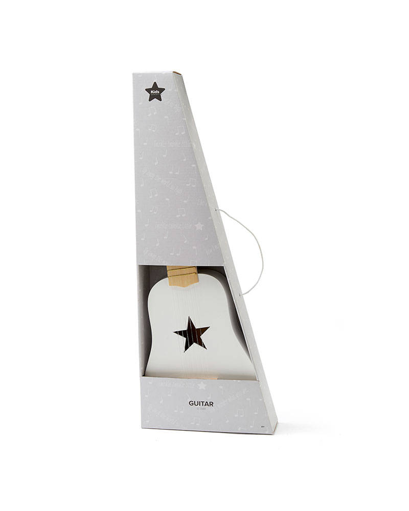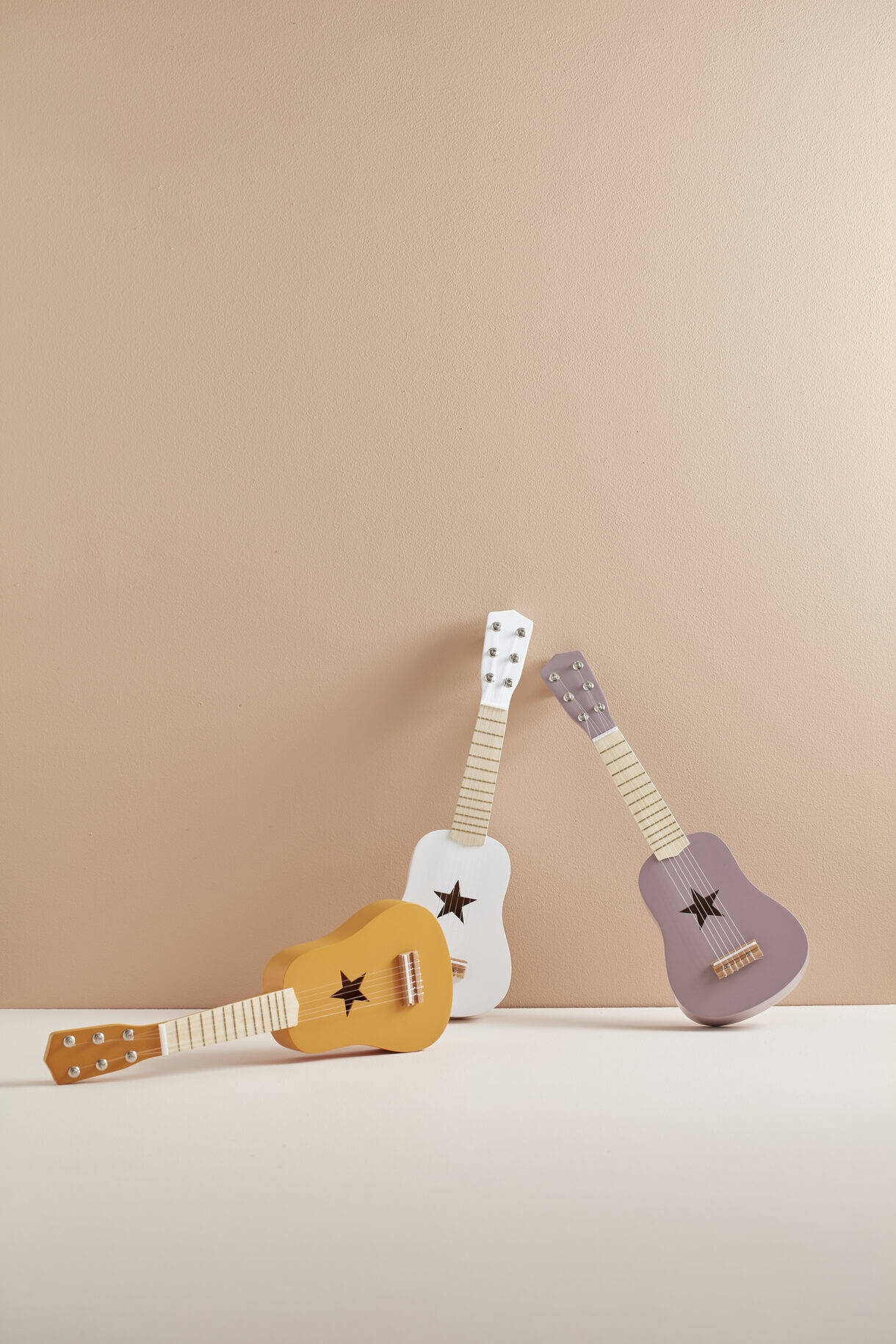 Drewniana gitara zabawkowa z wycięciem w kształcie gwiazdy.