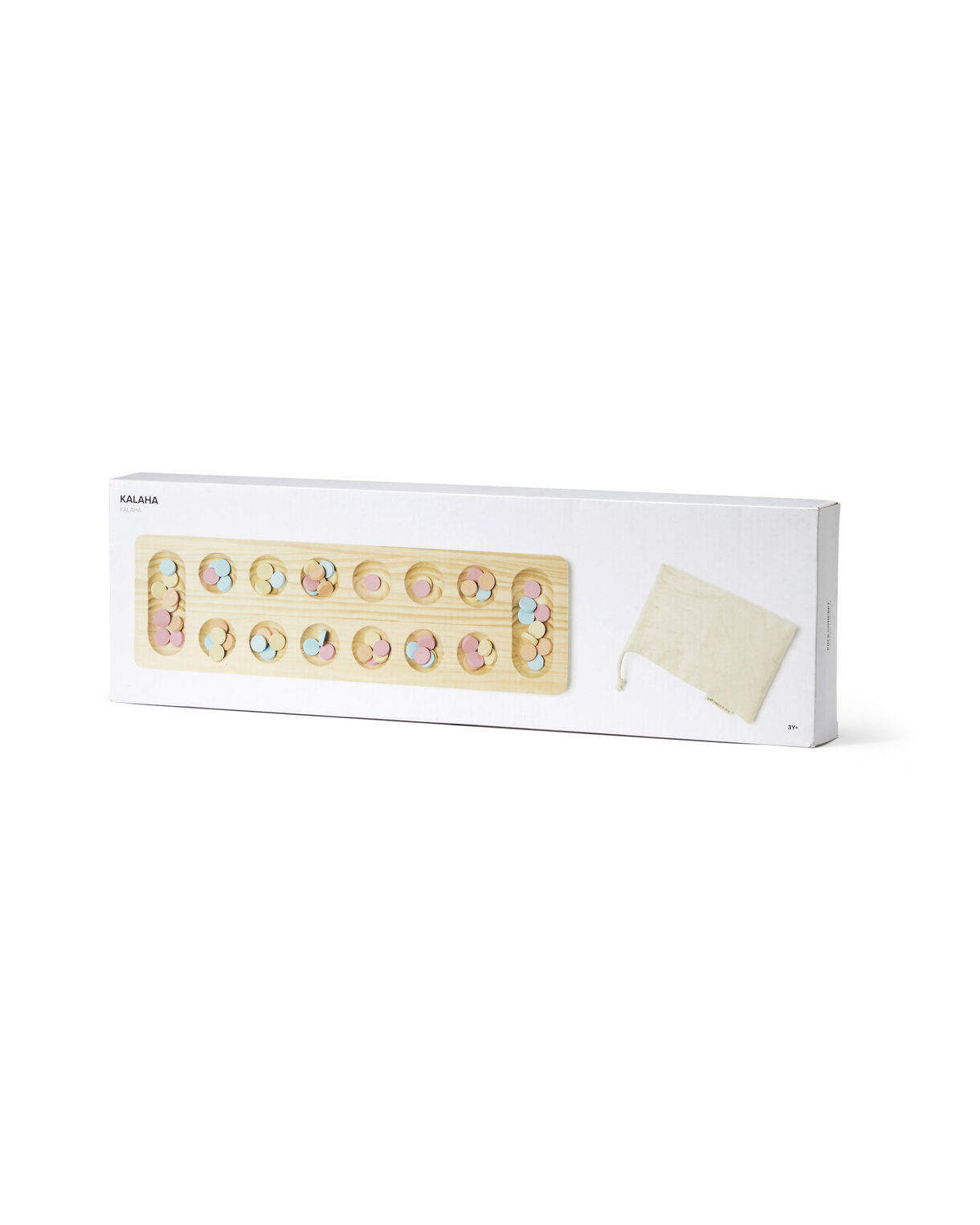 Kolorowa gra Kalaha, składająca się z 48 kamieni i planszy wykonanej z drewna z certyfikatem FSC. Celem jest zebranie jak największej liczby kamieni w dołku.