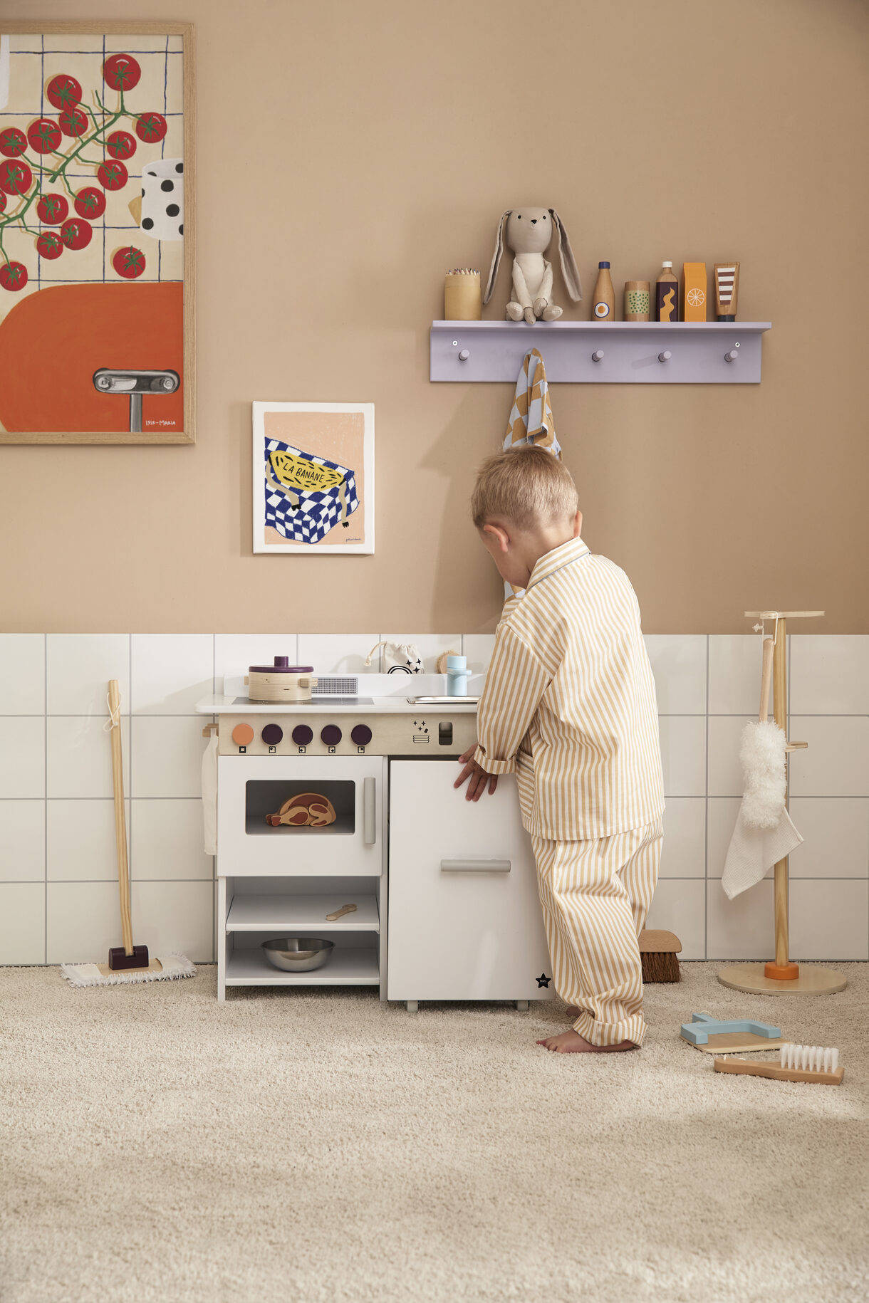Bez obaw. Ta współczesna kuchnia jest wykonana z drewna z certyfikatem FSC i wyposażona w zmywarkę do naczyń, piekarnik, zlewozmywak, półki i zintegrowany okap kuchenny. Umieść kilka talerzy i sztućców na podstawce w zmywarce, a tabletkę włóż do otworu z przodu. Przekręć klikające pokrętło i gotowe. Jest też szczoteczka do mycia naczyń i płyn do usuwania wszelkich trudnych plam. Z boku znajdziesz trzy wieszaki, na których możesz zawiesić ściereczkę do naczyń. Zmywarka i przestrzeń pod piekarnikiem po zakończonej zabawie mogą stać się praktycznym schowkiem. Zestaw zawiera: kuchenkę i zmywarkę, ręcznik, szczoteczkę do naczyń, blachę do pieczenia, dozownik mydła w płynie z pompką i dwie tabletki do zmywarki w torbie do przechowywania.