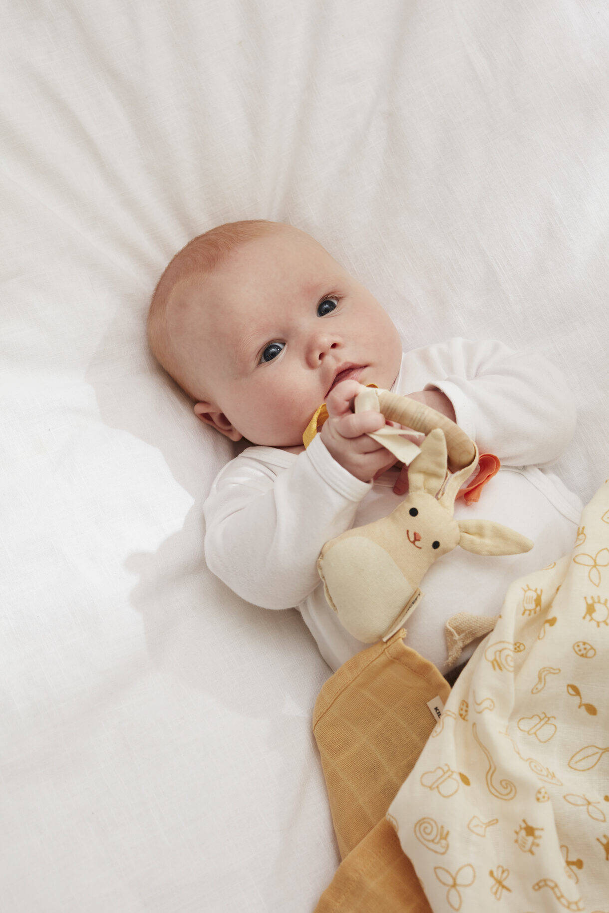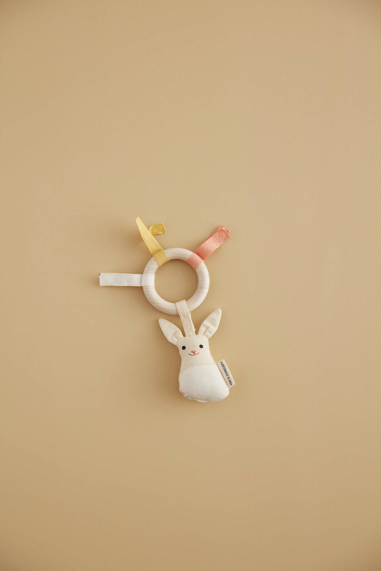 Mięciutką zabawkę z zapięciem na rzep łatwo odczepisz, by zabrać ją na przejażdżkę. Możesz ją przyczepić do wózka albo położyć na przewijaku. Elementy o różnej fakturze: drewniane kółko, z drewna bukowego z certyfikatem FSC do gryzienia, chwytania i zabawy; kolorowe wstążeczki i mięciutki króliczek stymulują zmysły i pozytywnie wpłyną na rozwój sensoryczny Twojego dziecka.
