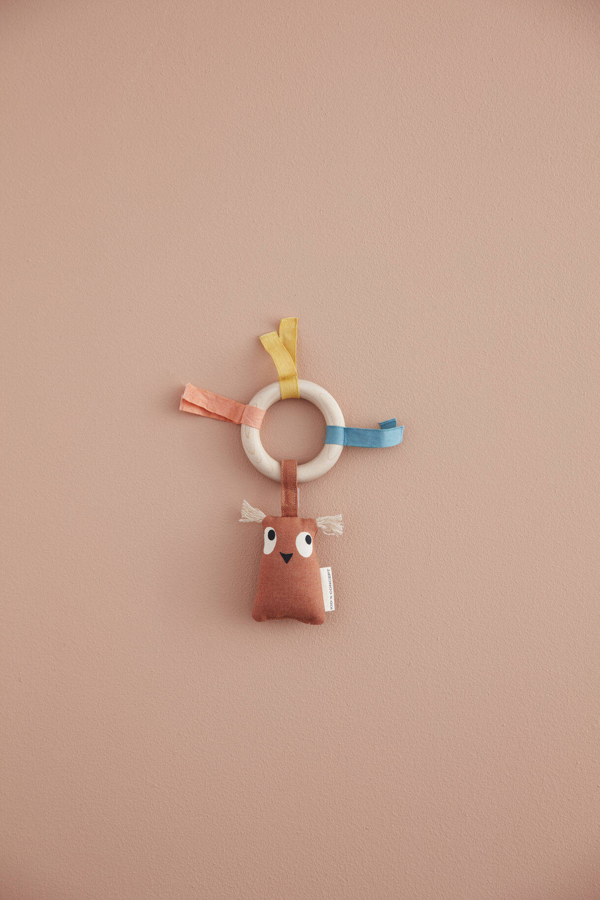 Elementy o różnej fakturze: drewniane kółko z drewna bukowego z certyfikatem FSC - do gryzienia, chwytania i zabawy, kolorowe wstążeczki i mięciutka sowa stymulują zmysły i pozytywnie wpłyną na rozwój sensoryczny Twojego dziecka.
