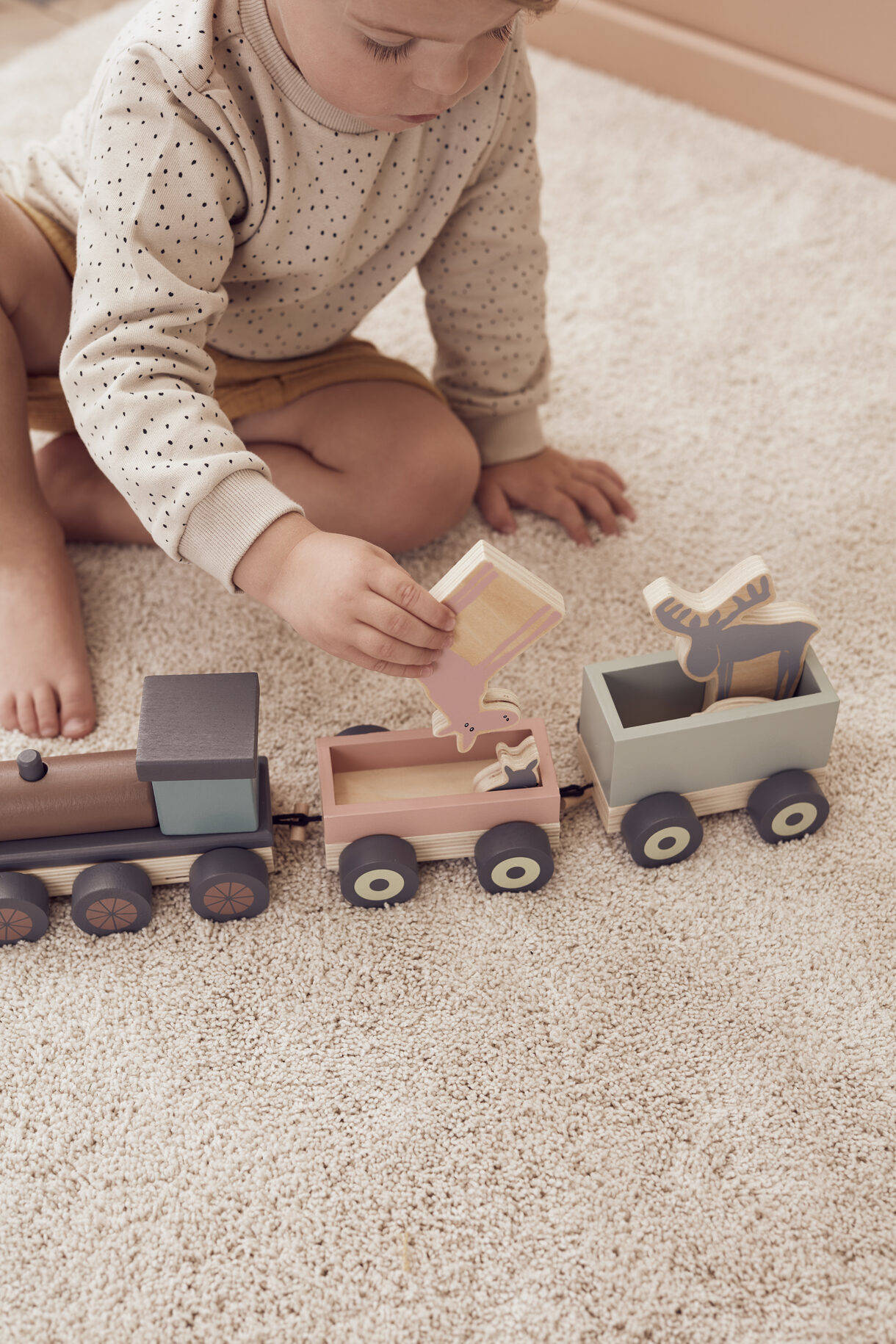 Zestaw zawiera pięć różnych figurek zwierząt, które mogą podróżować pociągiem.