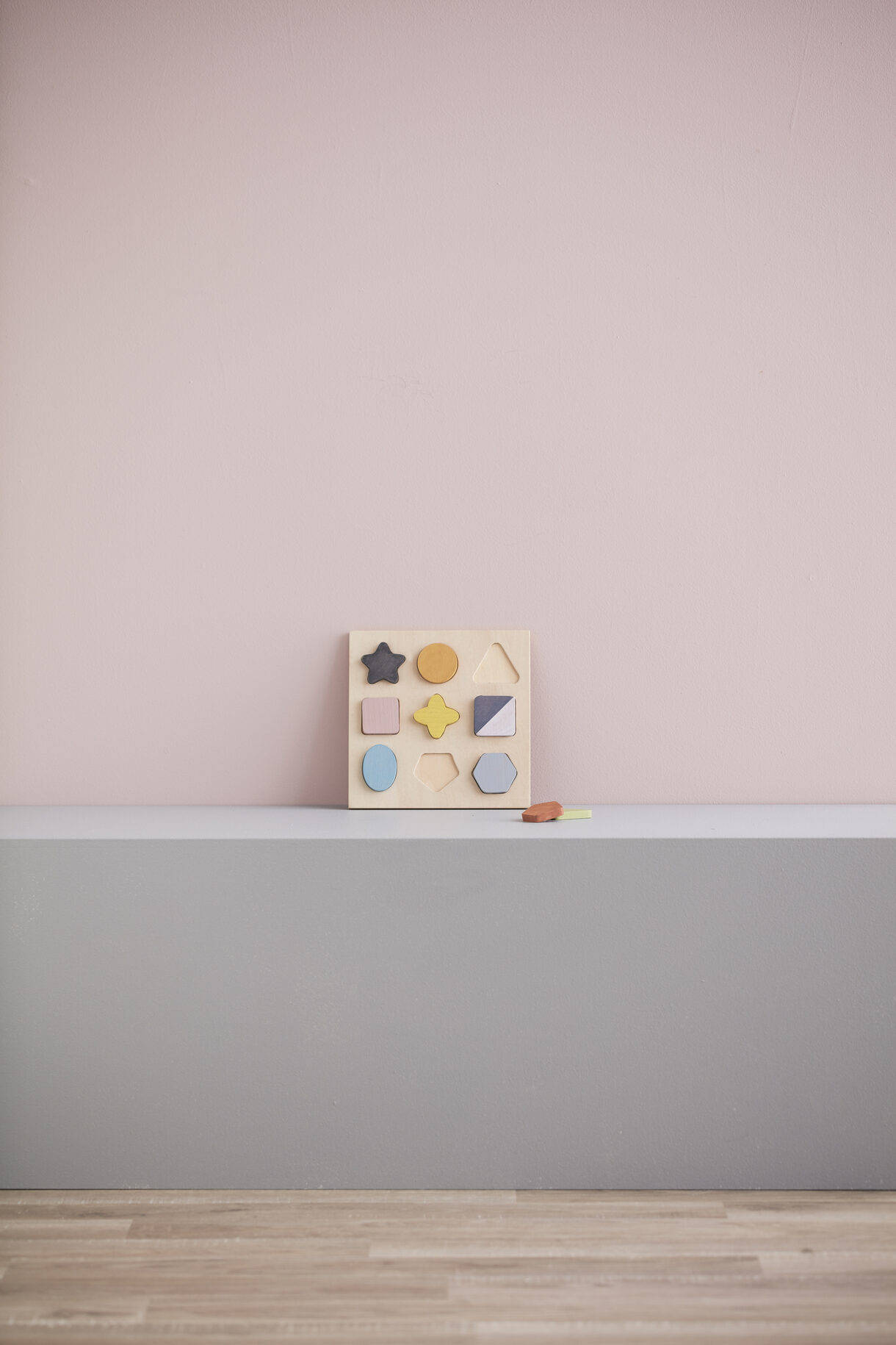 9-częściowa układanka, wykonana z drewna sosnowego, z elementami o różnych kształtach geometrycznych, w delikatnych pastelowych kolorach.