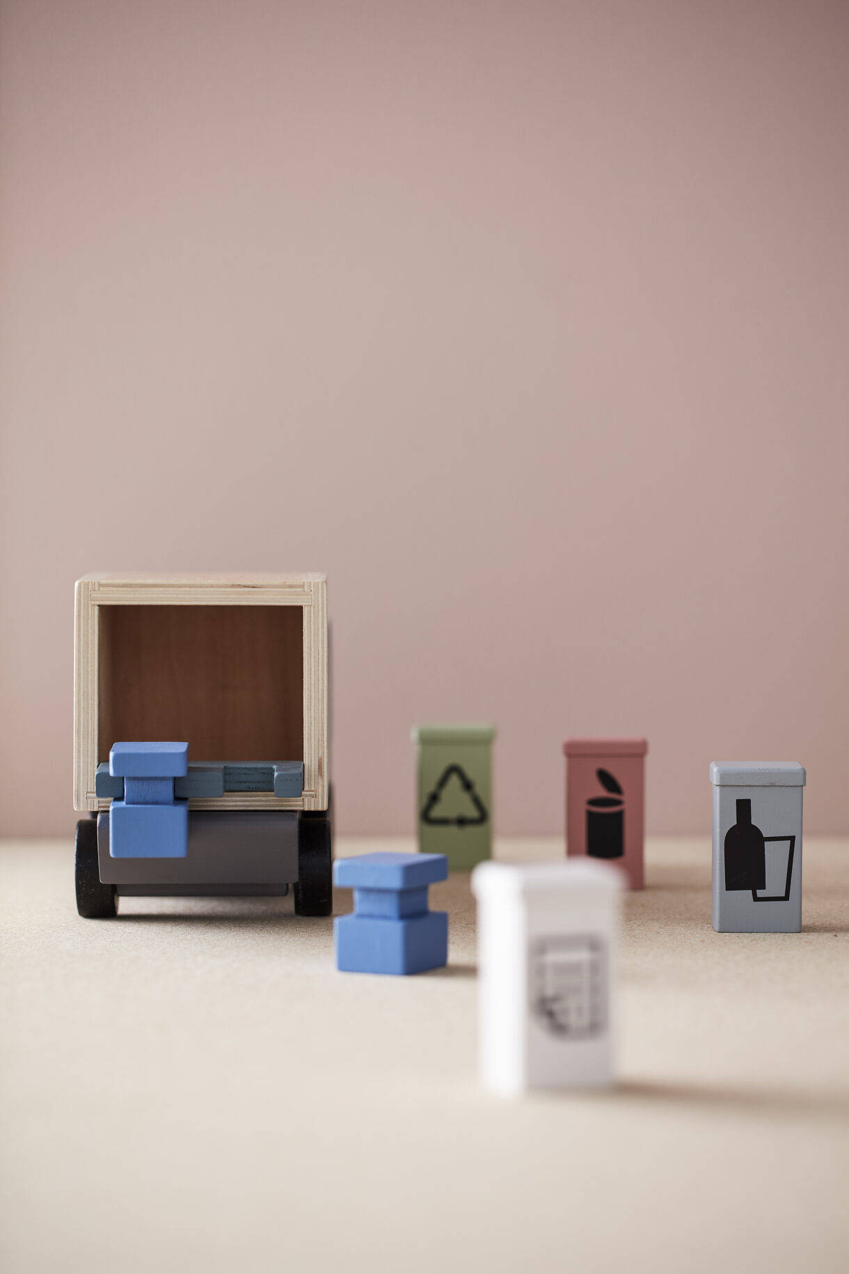 Czas na recykling! Drewniana śmieciarka z czterema pojemnikami do sortowania odpadów. Pojemniki można umieścić na podnośniku z tyłu i przenieść do ciężarówki.
