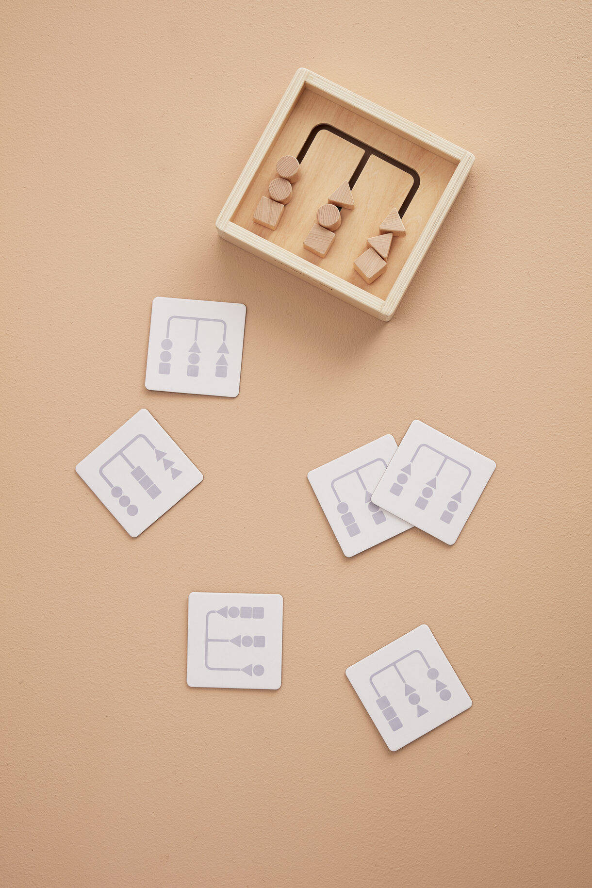 Do tablicy dołączonych jest sześć dwustronnych kart z kolorami po jednej stronie i różnymi kształtami po drugiej. Wybierz jedną z kart i odtwórz obrazek na tablicy. Kiedy już uda Ci się odtworzyć rysunki ze wszystkich kart, zabawa wcale się nie skończy. Możesz sam wymyślić nowe wzory z koralików lub figur! Zostań małym geniuszem! Tablica kolorów i kształtów rozwija zdolności motoryczne dziecka i uczy rozwiązywania problemów.