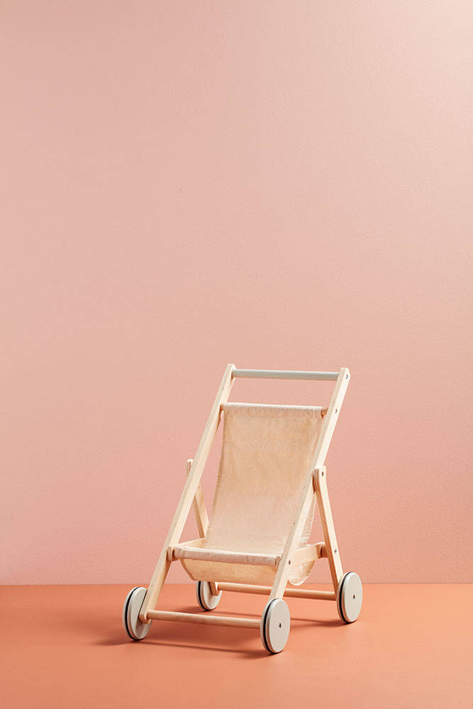 Wózek ma urocze zielone koła i małą kieszeń z tyłu, a pod siedziskiem znajduje się dodatkowy schowek na wszystko, czego potrzebujesz do pielęgnacji lalki i miękkich zabawek. Do jego wykonania użyto przede wszystkim niebielonej bawełny i sklejki lipowej. Zarówno Teddy, jak i Dolly będą wygodnie siedzieć podczas wszystkich Twoich podróży.