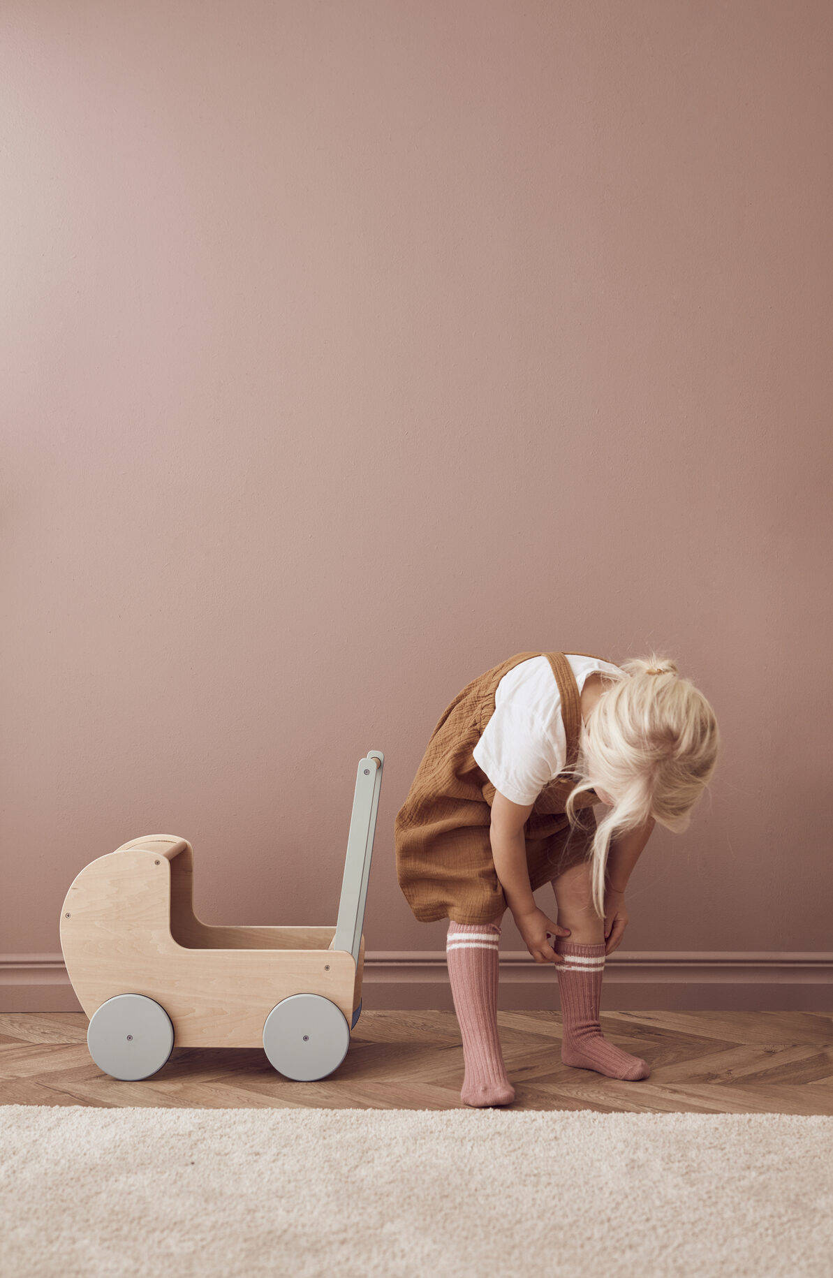 Drewniany wózek dla lalek z rączką i kółkami w kolorze zgaszonej zieleni. W zestawie prześcieradło i poduszka z białej bawełny. Wózek zachęca do odgrywania ról oraz do zabawy lalkami i miękkimi zabawkami. Koła mają gumowe zabezpieczenia, dzięki temu odgłosy jeżdżenia są stłumione, a wózek jest bardziej miękki i stabilny. Wózek sprawdzi się także jako wsparcie przy stawianiu pierwszych kroków.