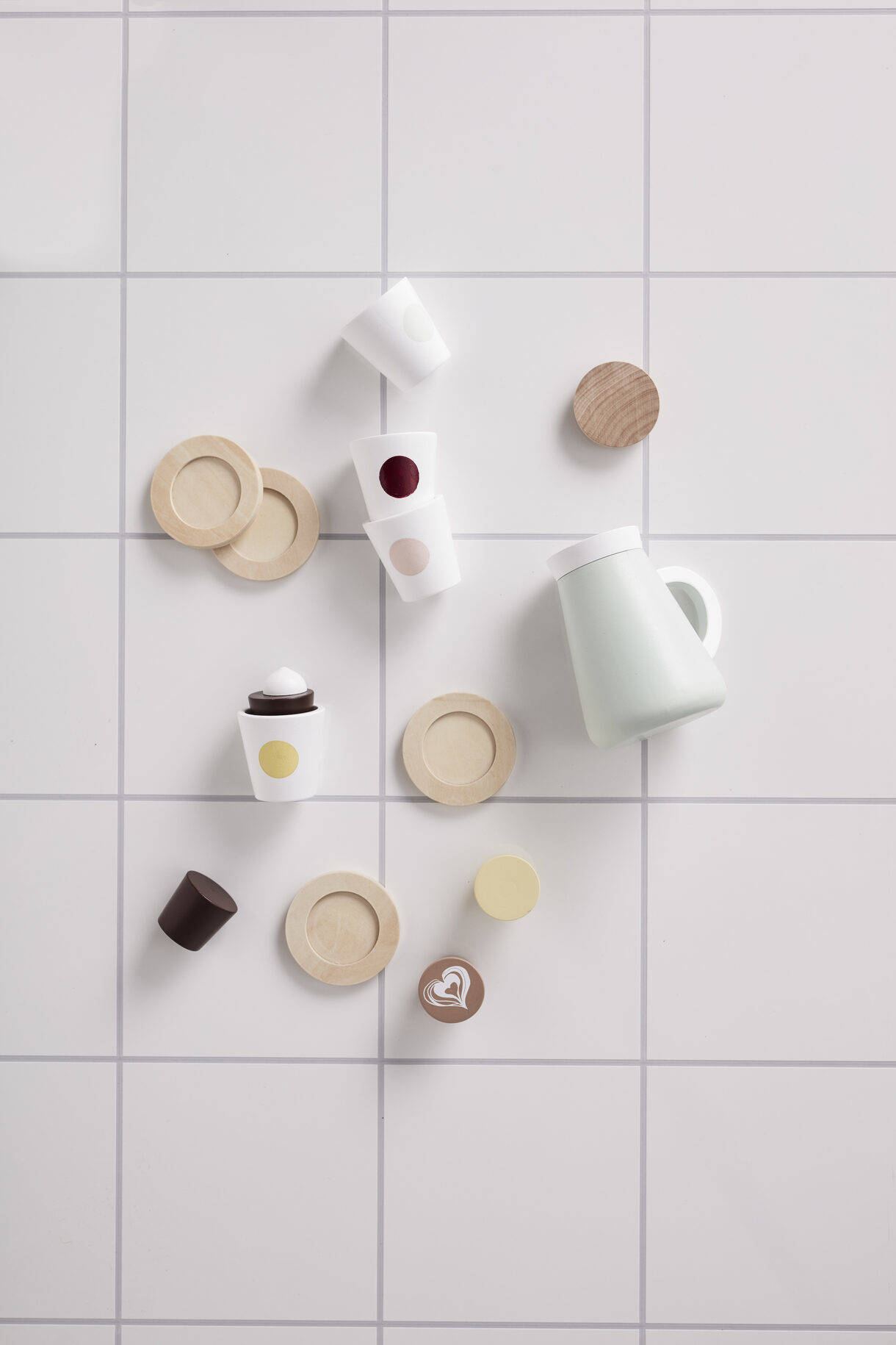 Ten drewniany zestaw FIKA zawiera termos ze zdejmowaną pokrywką, 4 różne kubki i cylindryczne klocki-napoje, które pasują do kubków. Masz do wyboru czarną kawę, cafe au lait, gorącą czekoladę z bitą śmietaną i herbatę. Napełnij kubki różnymi napojami i zrób sobie z przyjaciółmi przerwę na kawę, lub zaproponuj coś do picia mamie i tacie.
