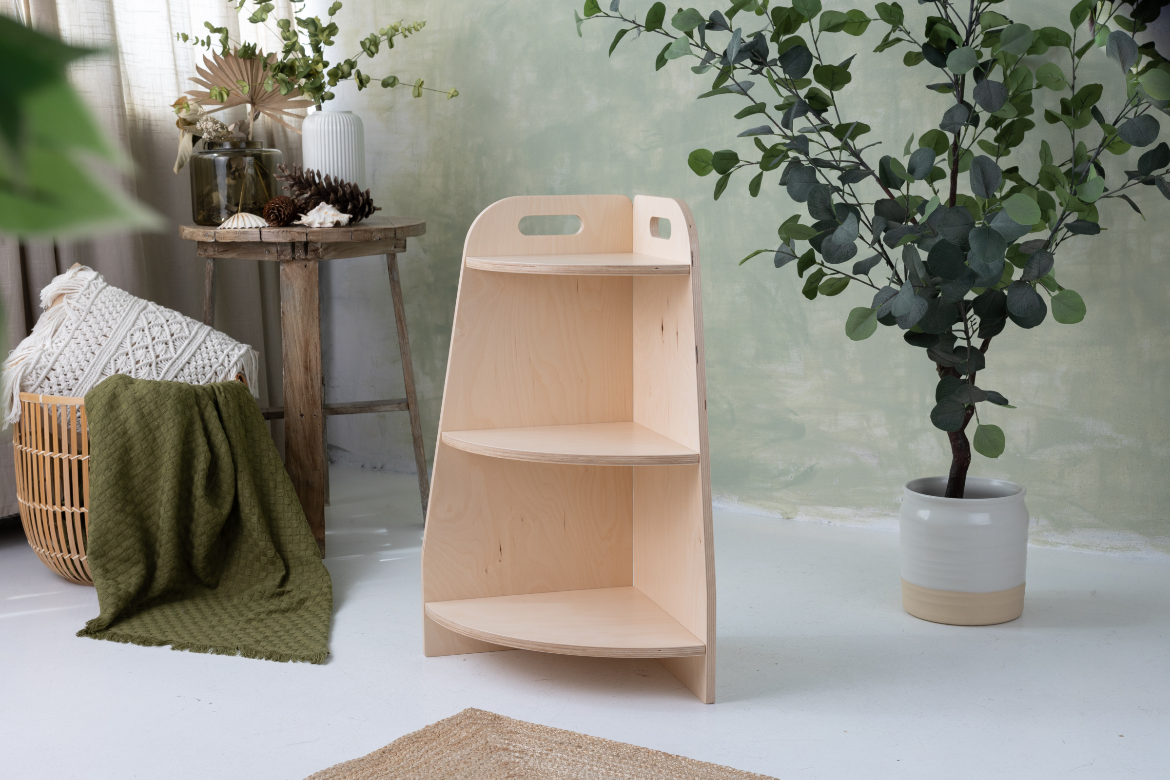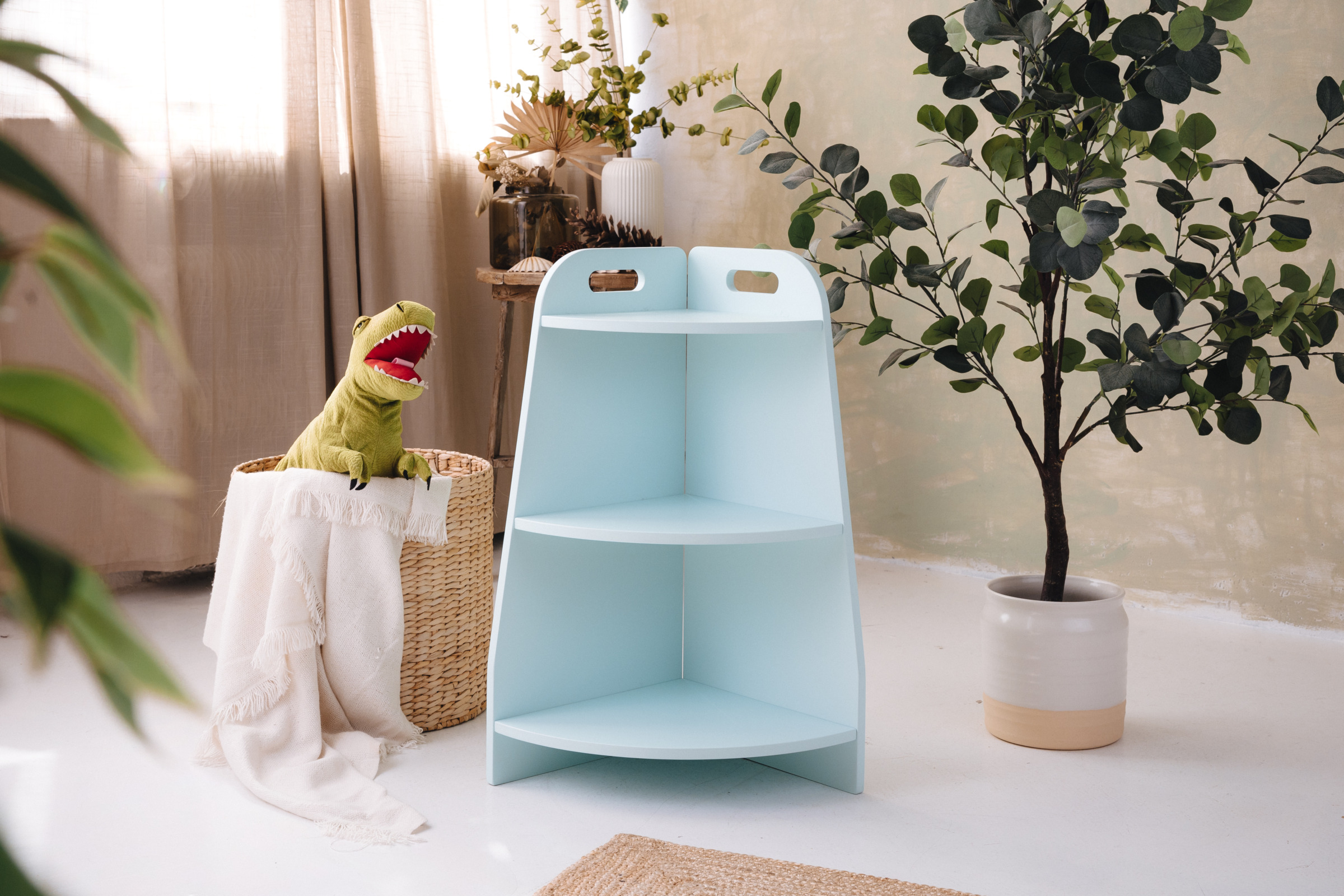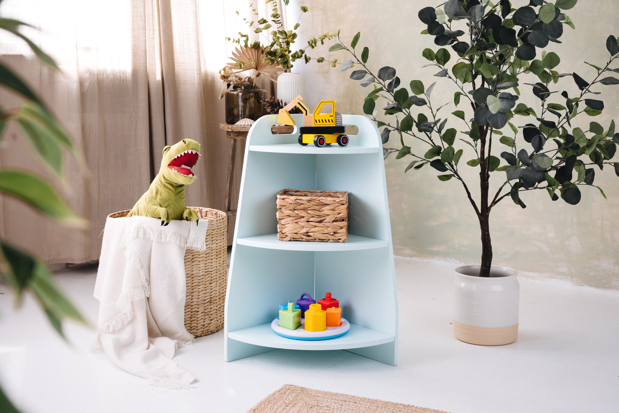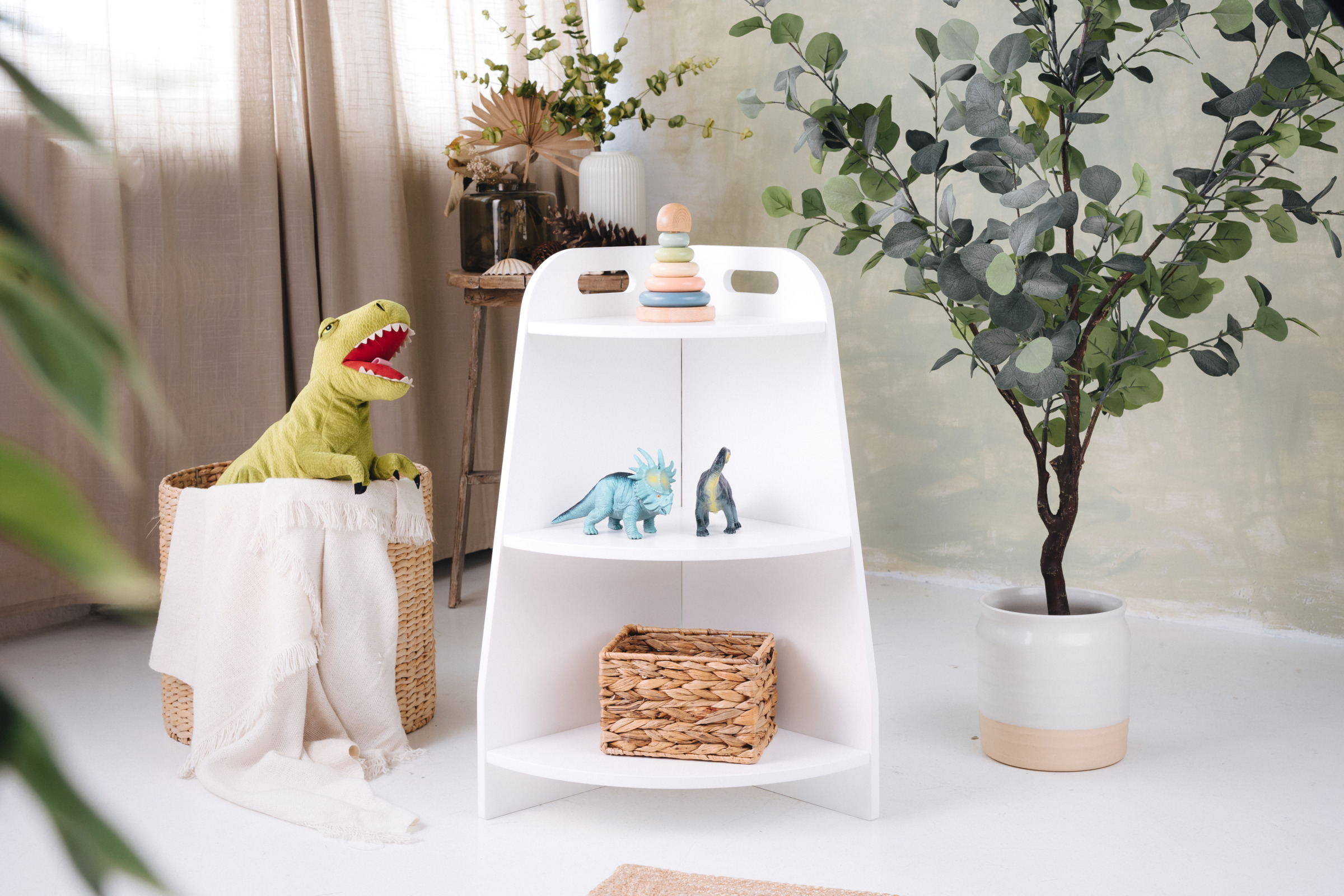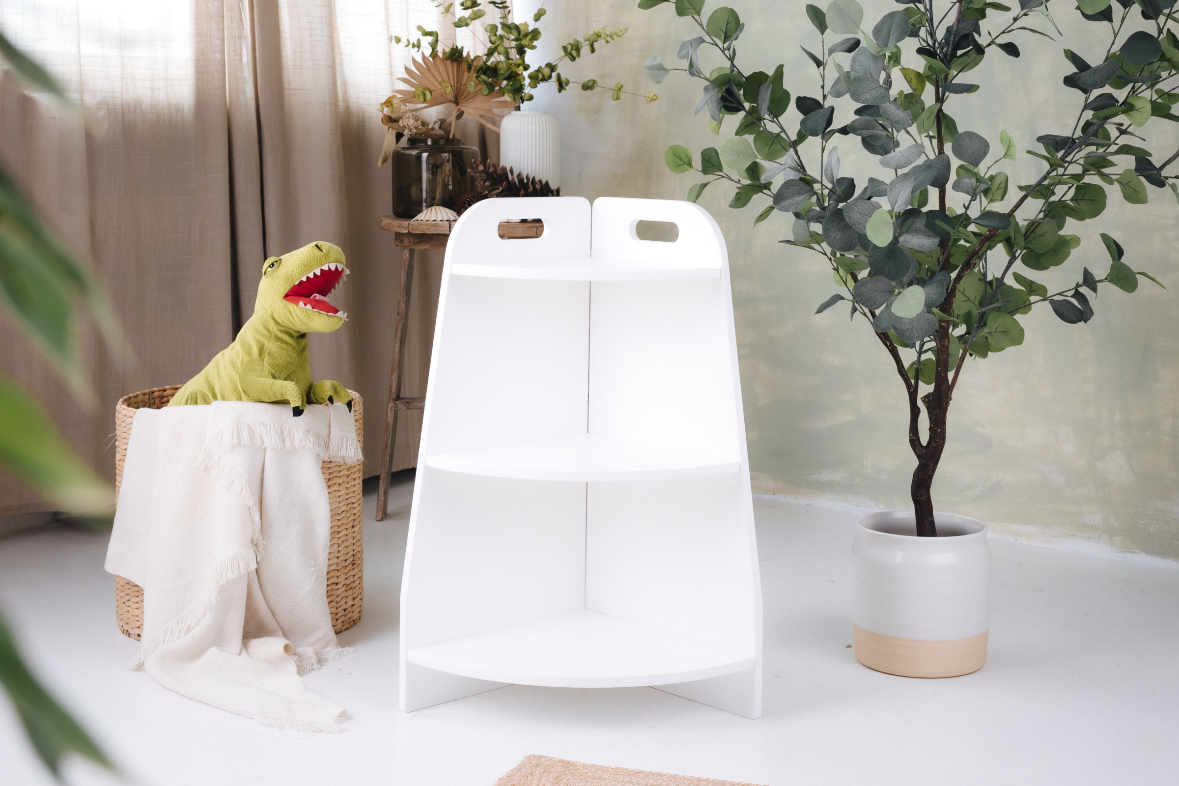 Regał na zabawki posiada trzy półki, do których dziecko ma nieograniczony dostęp. Mebel stoi bezpośrednio na podłodze i mierzy zaledwie 70cm wysokości.