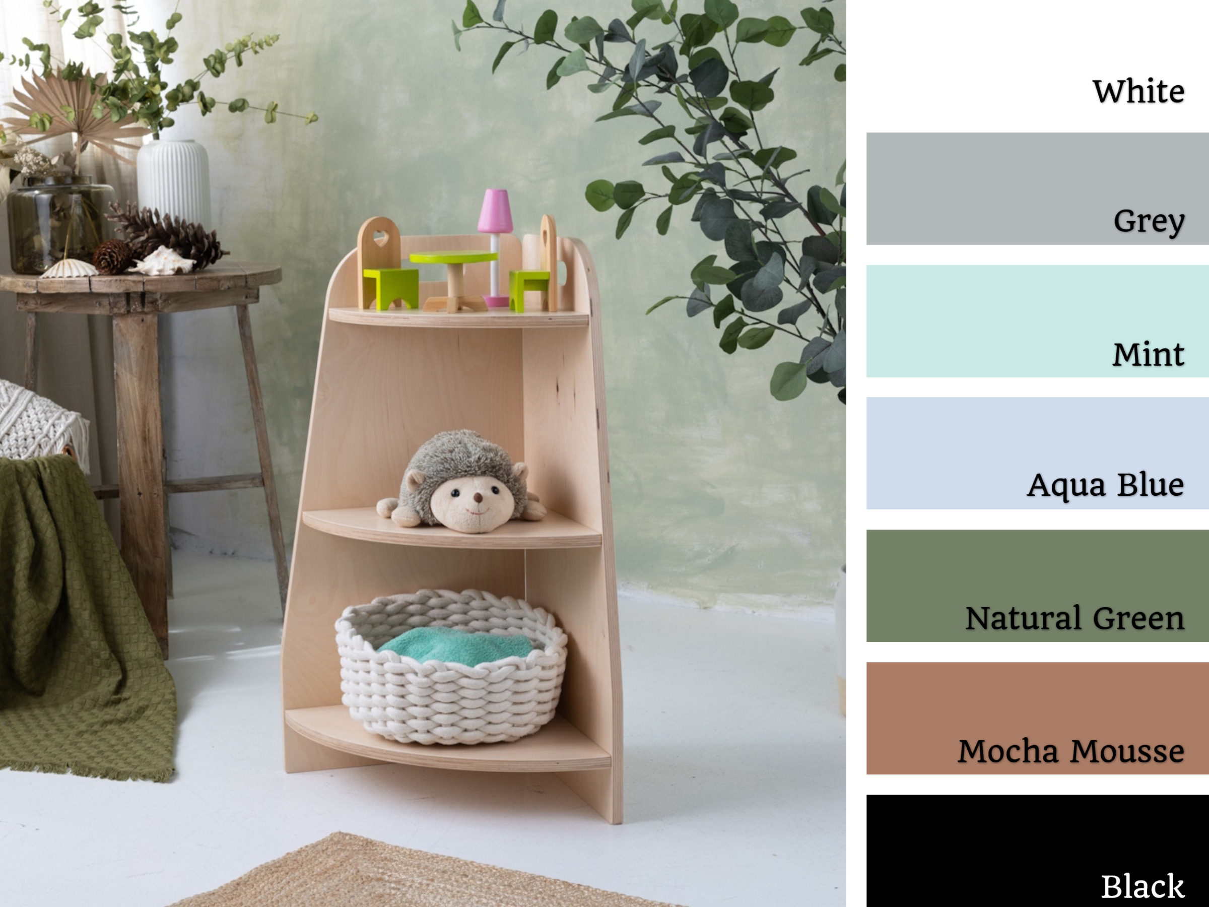 Regał na zabawki został wykonana ręcznie ze sklejki o grubości 15mm wyprodukowanej z drewna liściastego. Pomalowano go całkowicie bezpiecznymi dla środowiska i zdrowia dziecka lakierami i farbami spełniającymi m.in. warunki europejskiej normy PN EN 71.3.