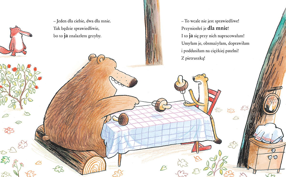 Niedźwiedź po drodze do domu znajduje w lesie trzy smakowite grzyby. Jego przyjaciółka, łasica, smaży je na patelni. Ale gdy siadają do stołu, pojawia się problem: jak podzielić trzy między dwoje? Każde z przyjaciół ma na ten temat inne zdanie i całe mnóstwo argumentów. Tak zaczyna się sprzeczka – a gdzie dwóch się kłóci…