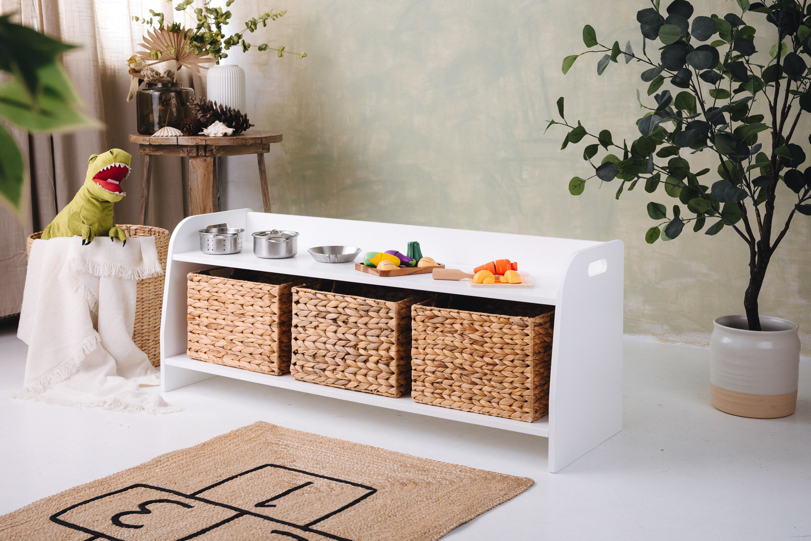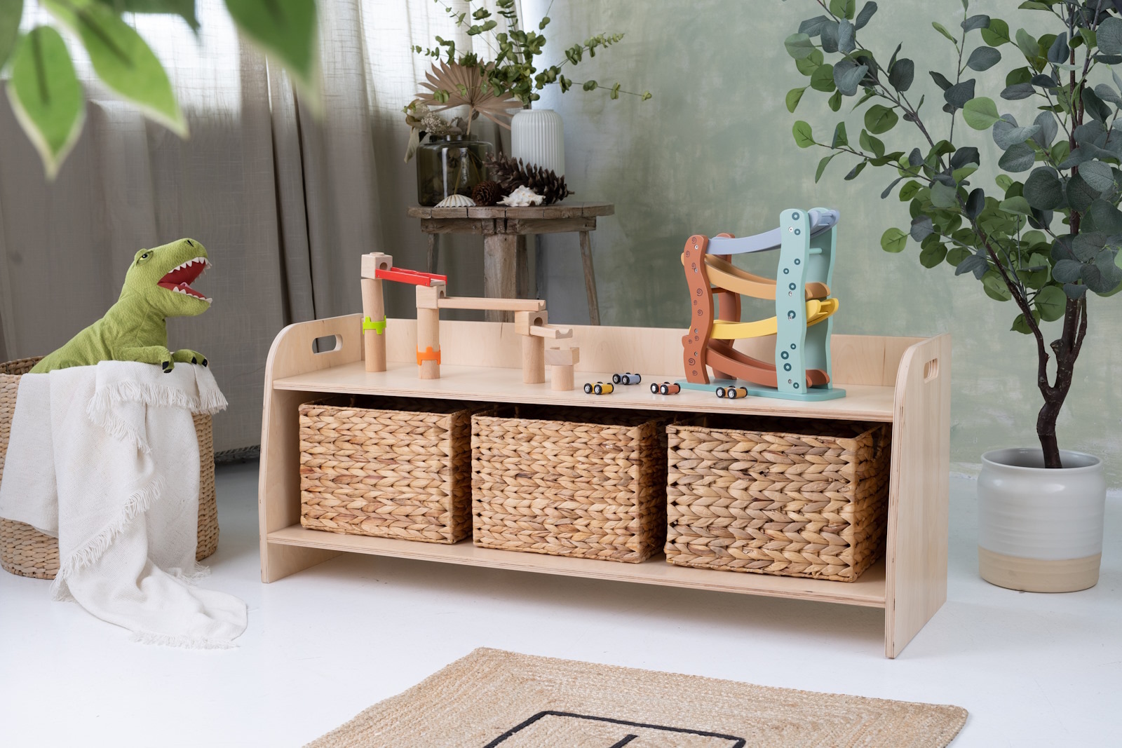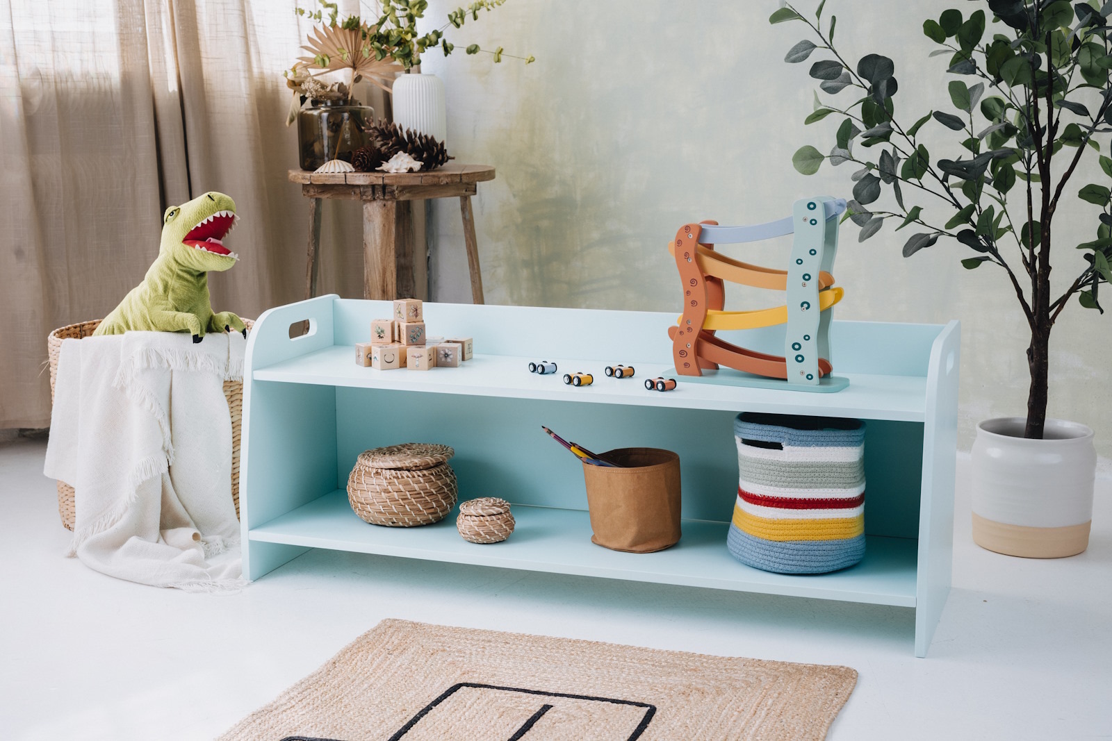 Regał na zabawki posiada dwie półki, do których dziecko ma nieograniczony dostęp. Mebel stoi bezpośrednio na podłodze i mierzy zaledwie 44cm wysokości.