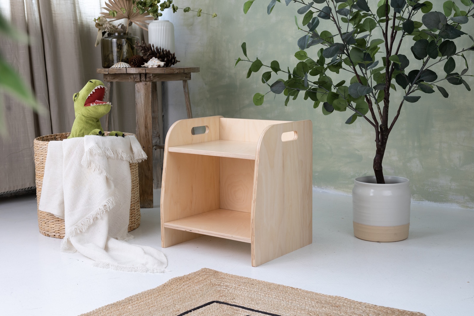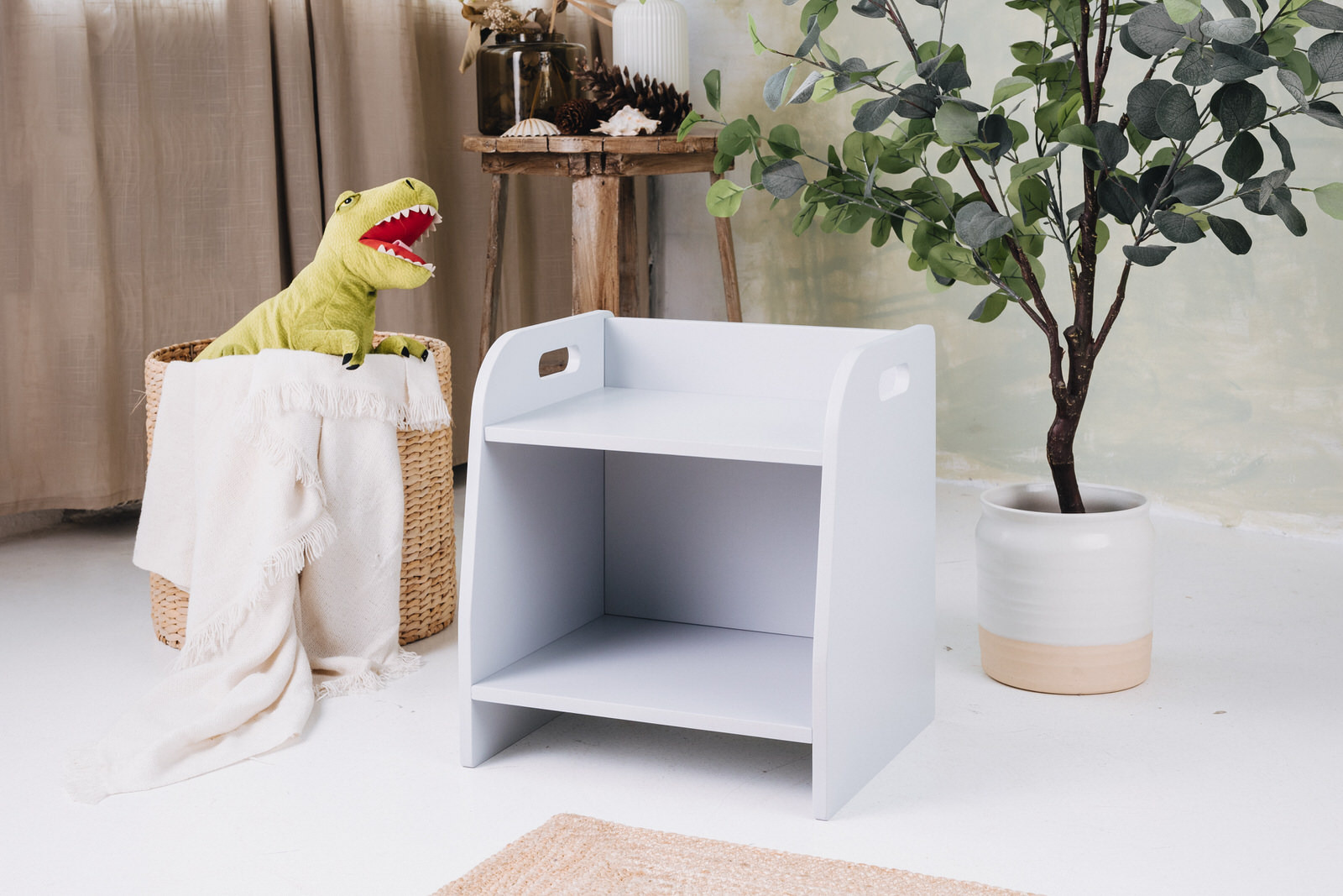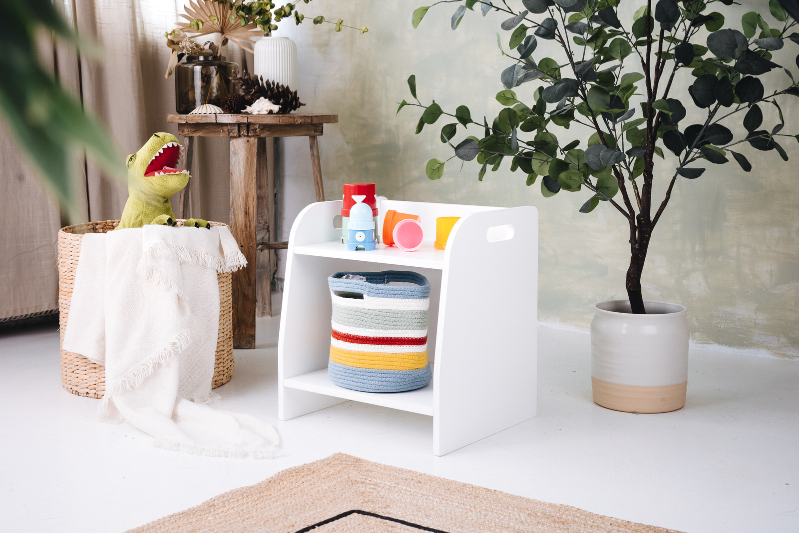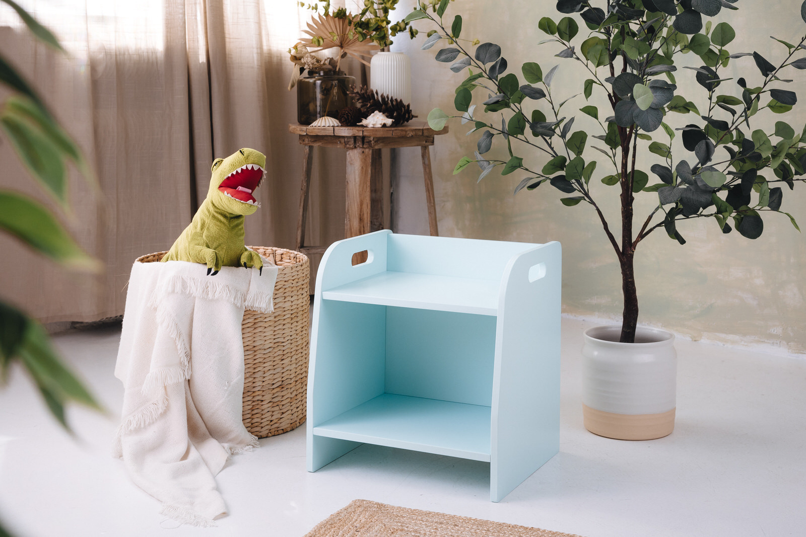 Regał na zabawki posiada dwie półki, do których dziecko ma nieograniczony dostęp. Mebel stoi bezpośrednio na podłodze i mierzy zaledwie 44cm wysokości.
