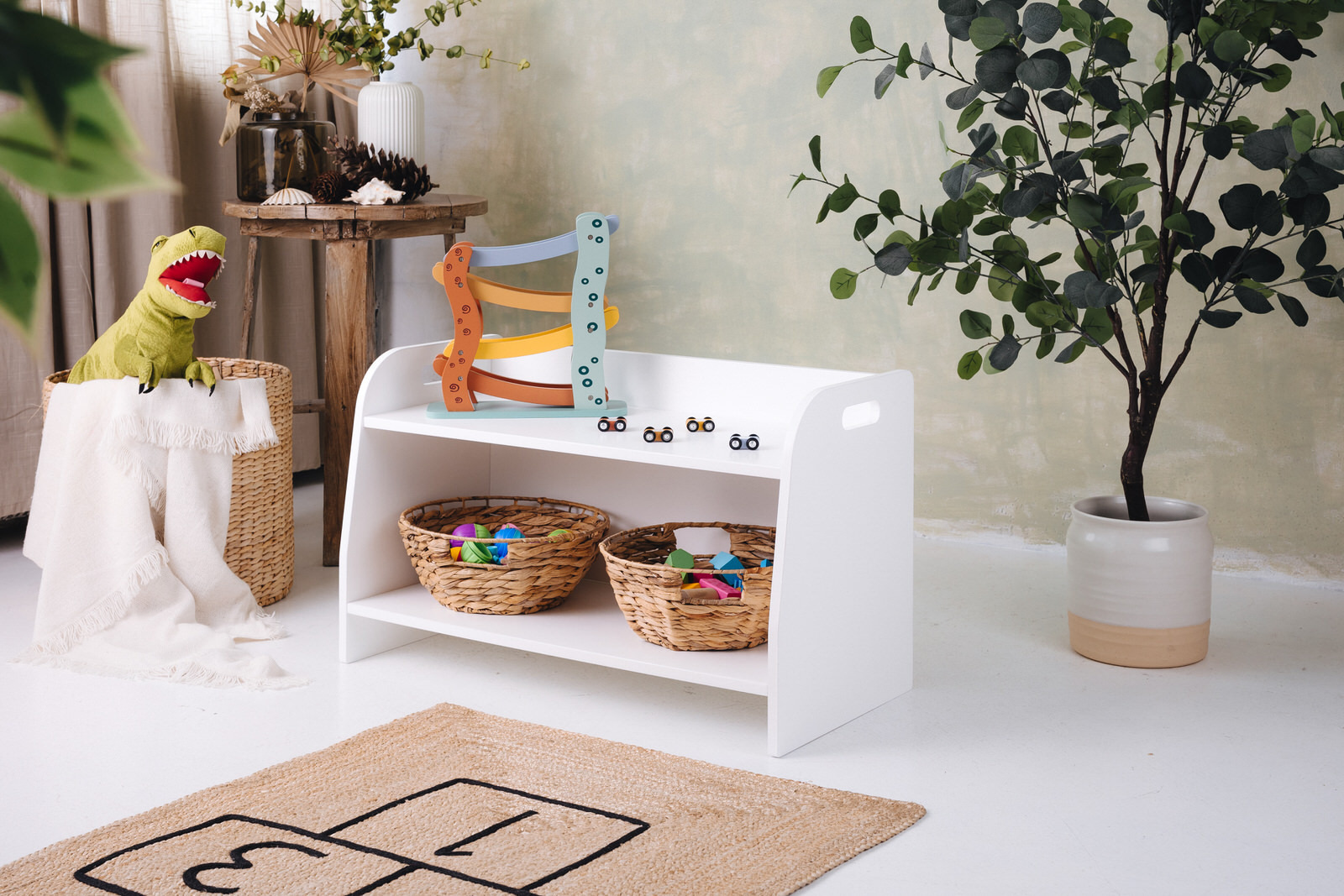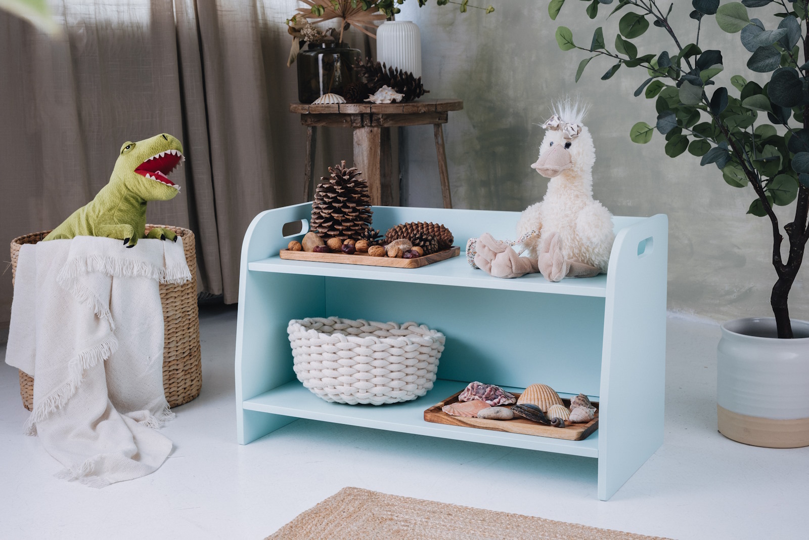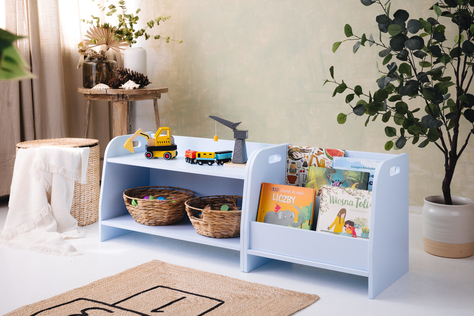 Regał na zabawki posiada dwie półki, do których dziecko ma nieograniczony dostęp. Mebel stoi bezpośrednio na podłodze i mierzy zaledwie 44cm wysokości.