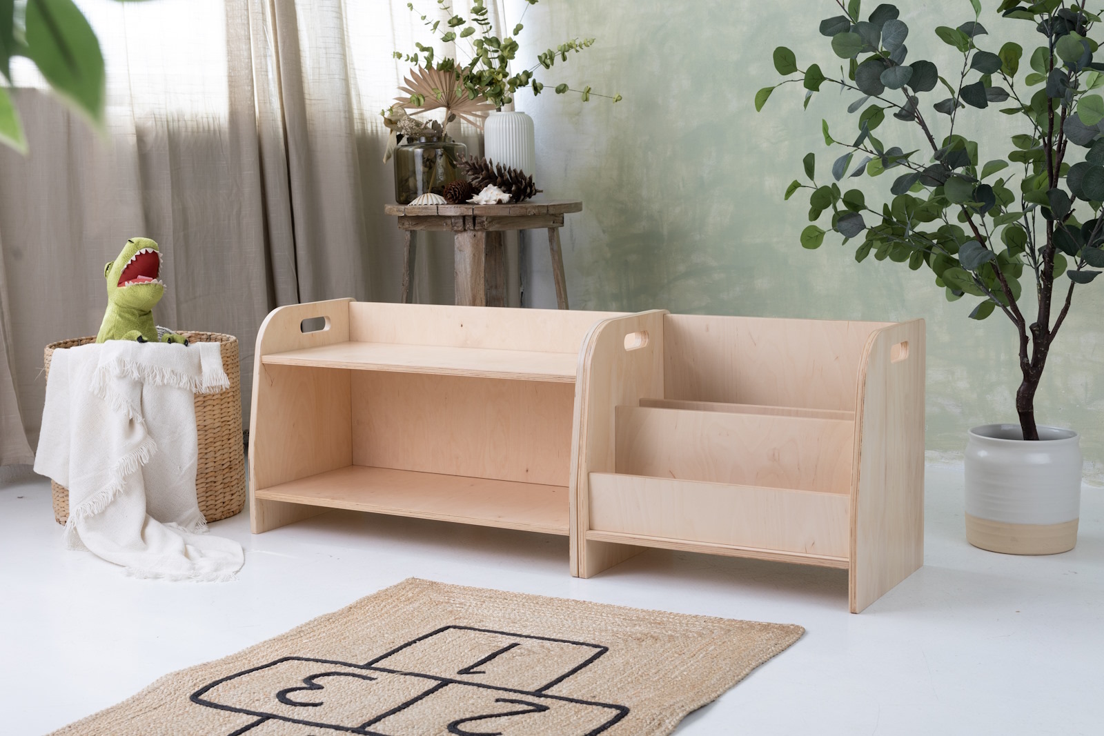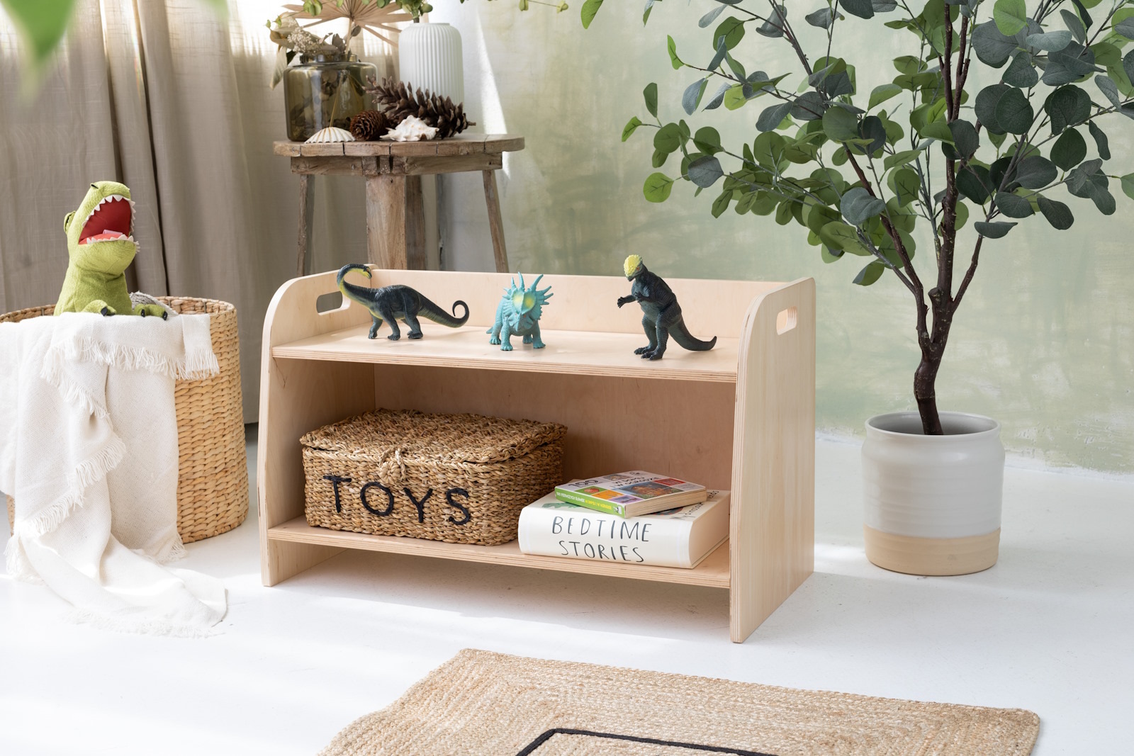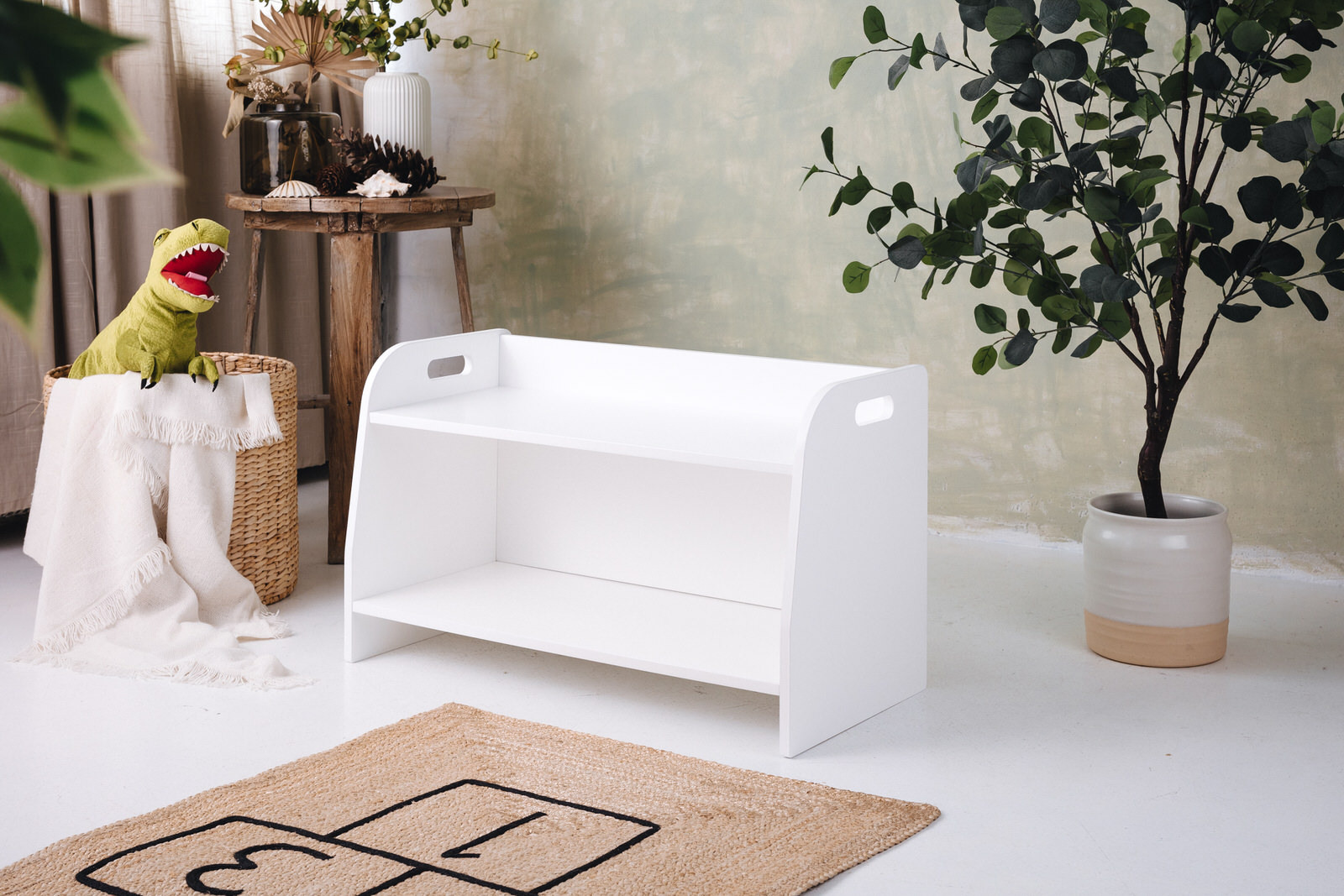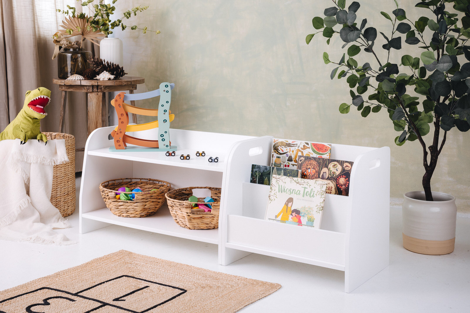 Regał na zabawki posiada dwie półki, do których dziecko ma nieograniczony dostęp. Mebel stoi bezpośrednio na podłodze i mierzy zaledwie 44cm wysokości.
