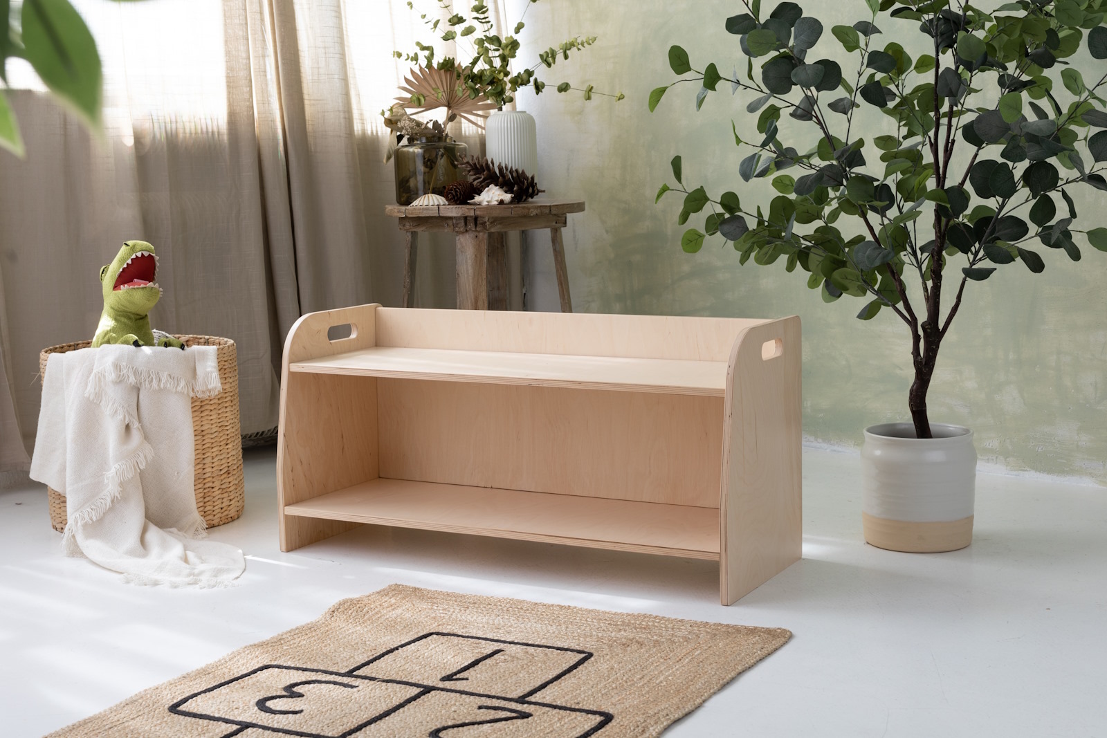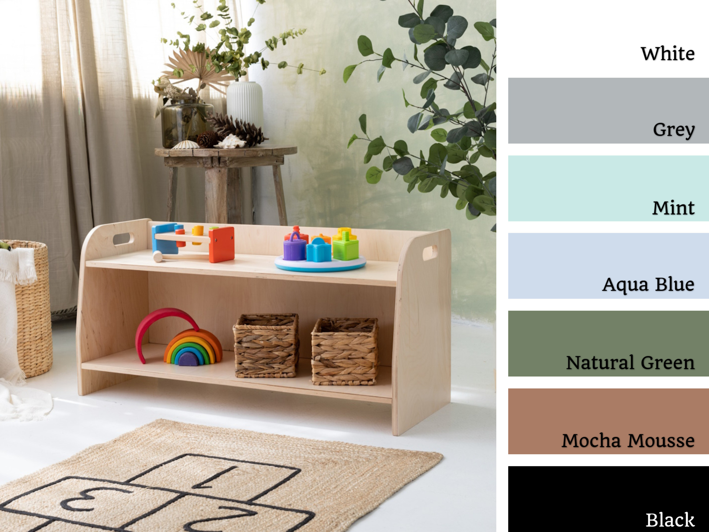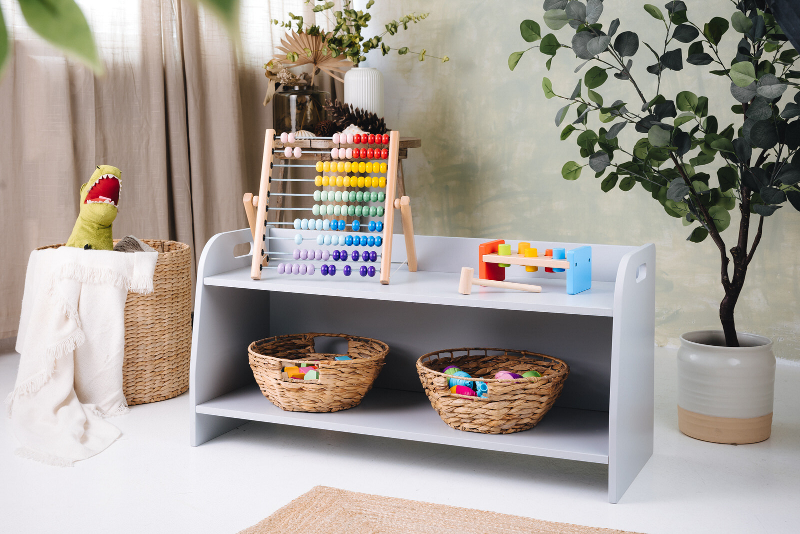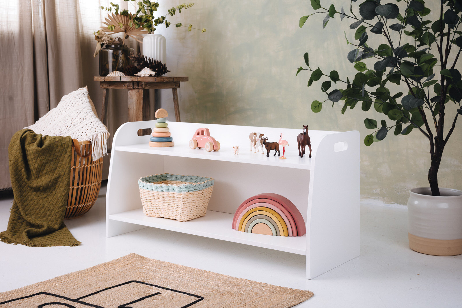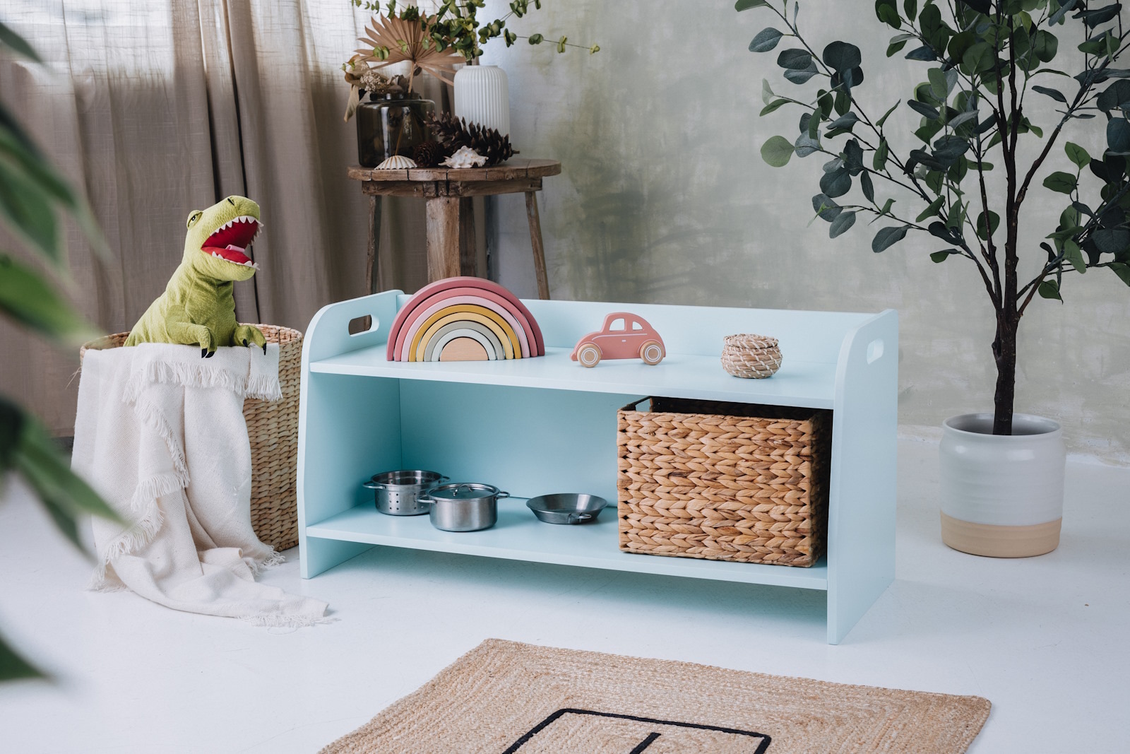 Regał na zabawki posiada dwie półki, do których dziecko ma nieograniczony dostęp. Mebel stoi bezpośrednio na podłodze i mierzy zaledwie 44cm wysokości.