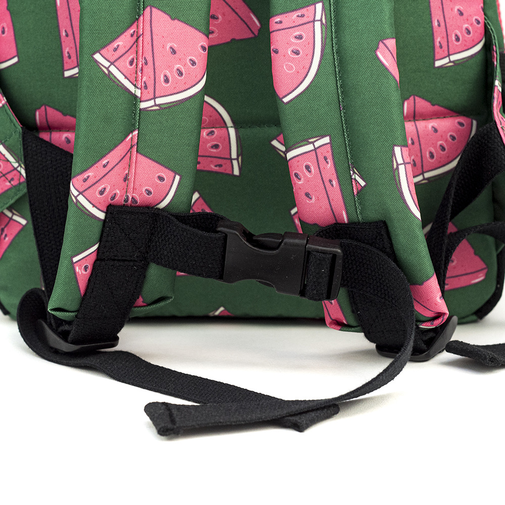 Plecak przedszkolny posiada regulowane szelki i pasek piersiowy, wspierający amortyzację – paski są bawełniane