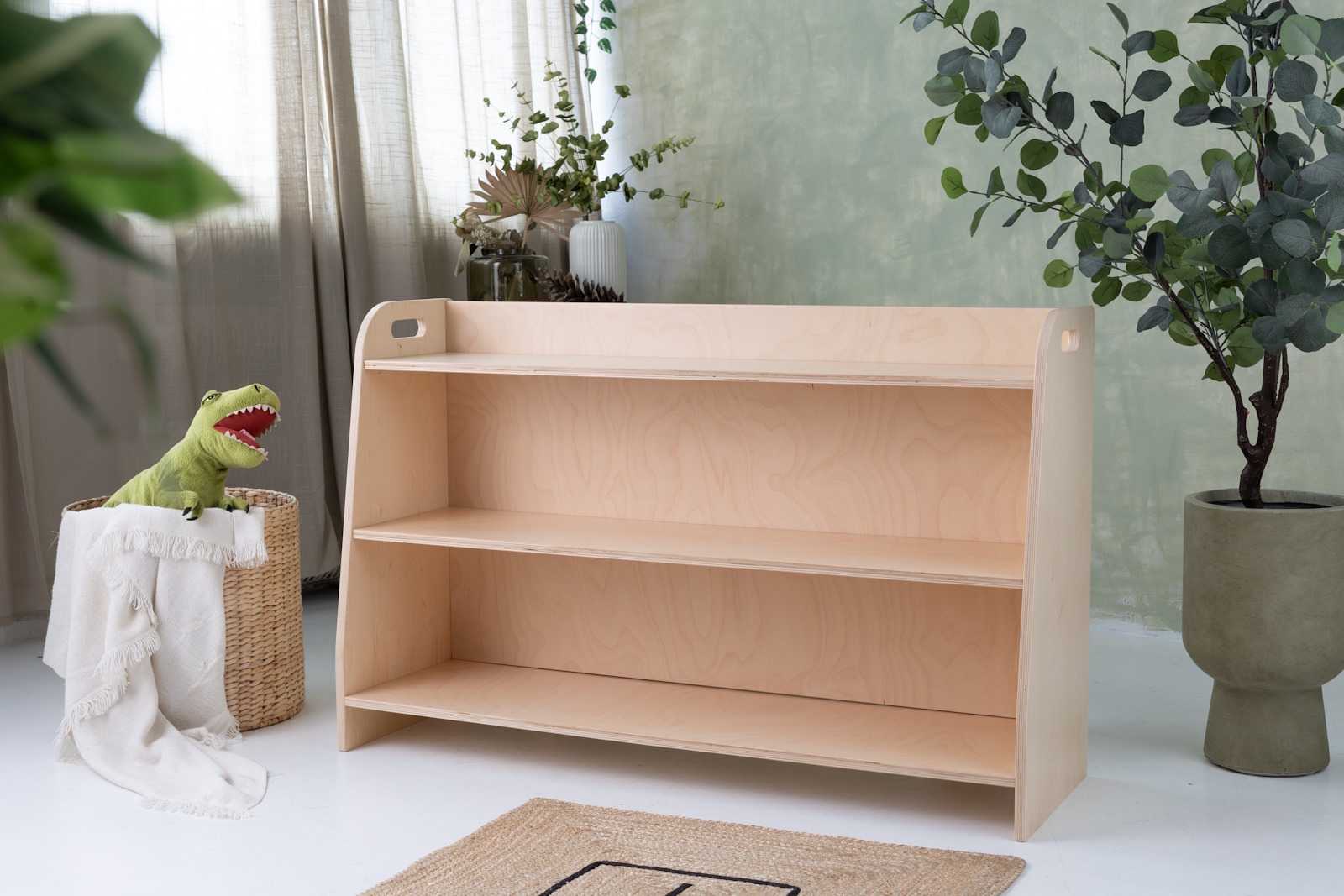 Regał na zabawki posiada trzy półki, do których dziecko ma nieograniczony dostęp. Mebel stoi bezpośrednio na podłodze i mierzy zaledwie 70cm wysokości.