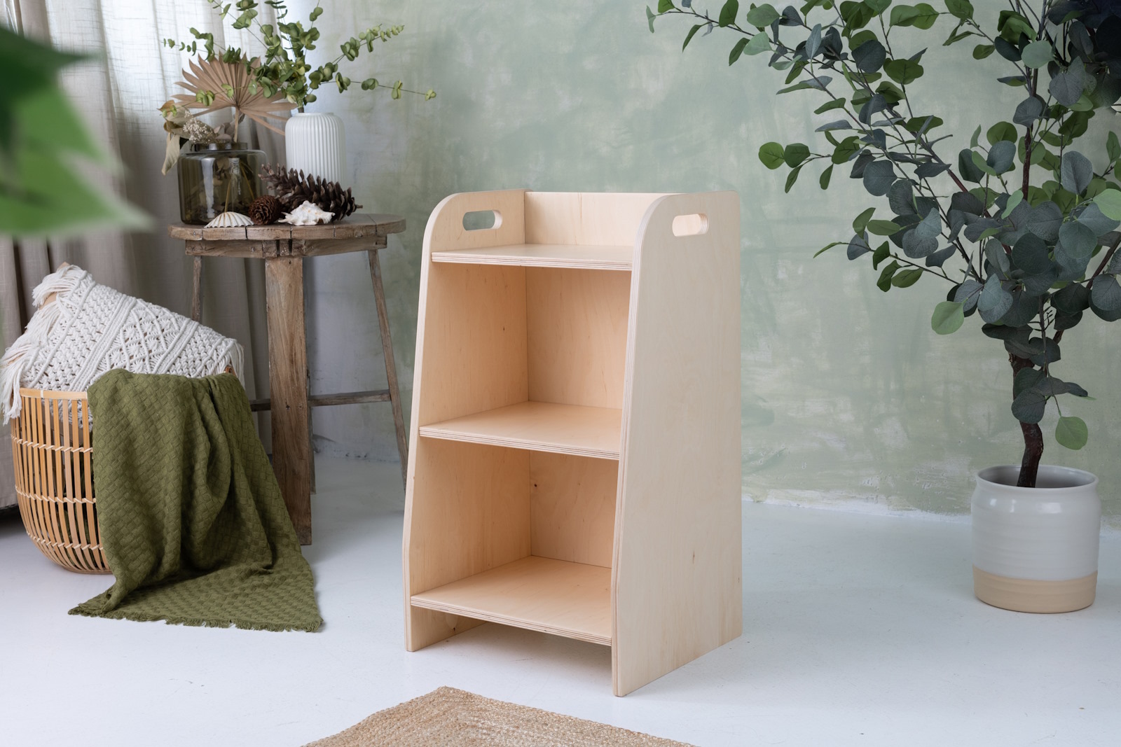 Regał na zabawki posiada trzy półki, do których dziecko ma nieograniczony dostęp. Mebel stoi bezpośrednio na podłodze i mierzy zaledwie 70cm wysokości.
