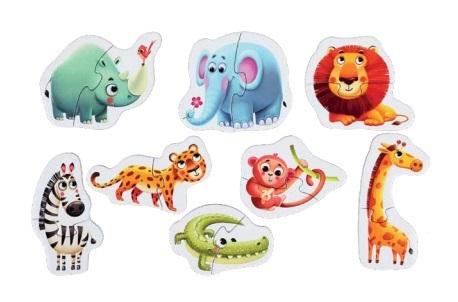 Zestaw składa się z 8 puzzli ze zwierzętami: żyrafa, krokodyl, zebra, nosorożec, słoń, lampart, lew, małpa. Aby uzyskać obrazek zwierzęcia, dziecko musi znaleźć i połączyć 2 odpowiednie elementy. To pierwsze układanki dla najmniejszych milusińskich, które dają wyobrażenie jak ułożyć cały obrazek z kawałków.