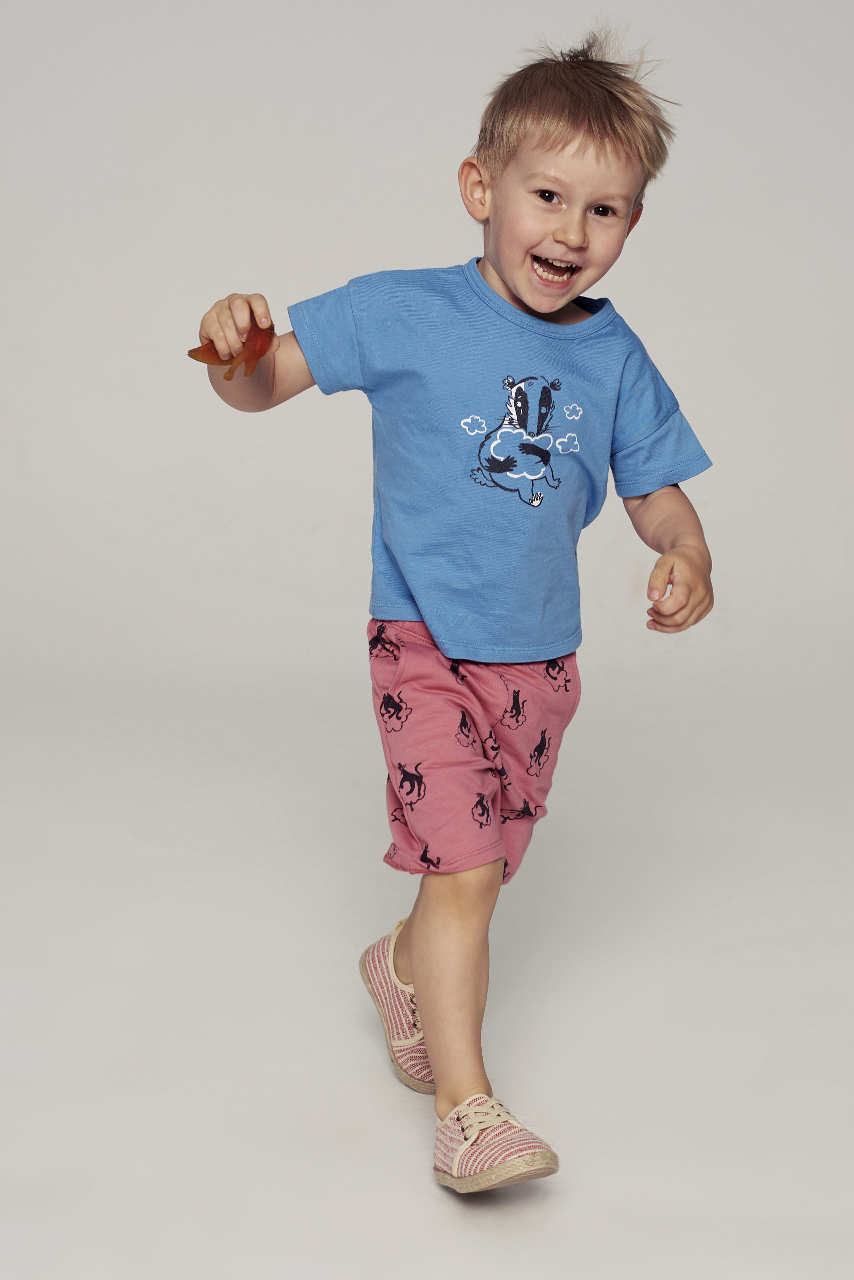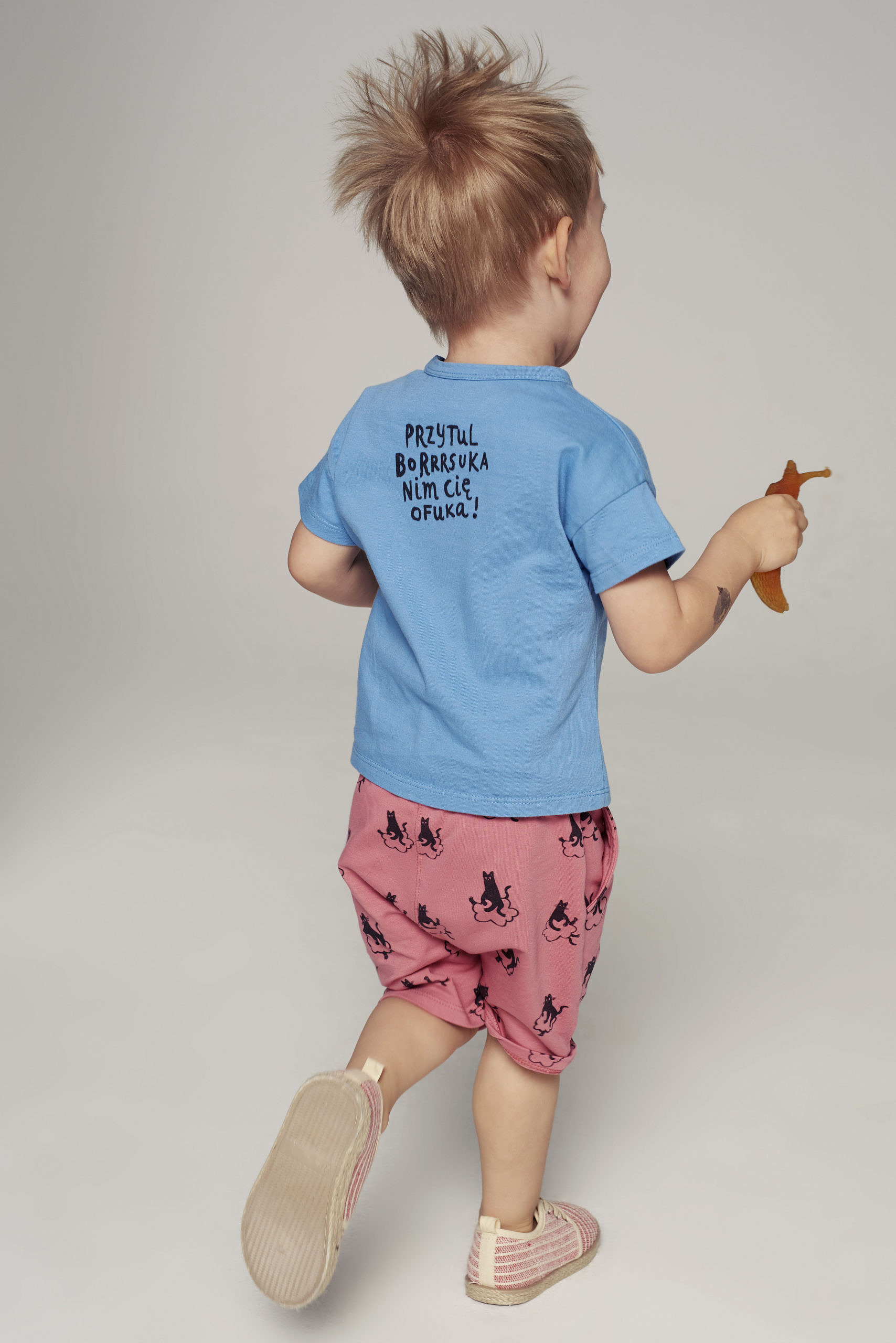 Niebieska koszulka z krótkim rękawkiem z sympatycznym borsukiem i wesołą rymowanką. Hasło na plecach: Przytul borrrsuka, nim cię ofuka!