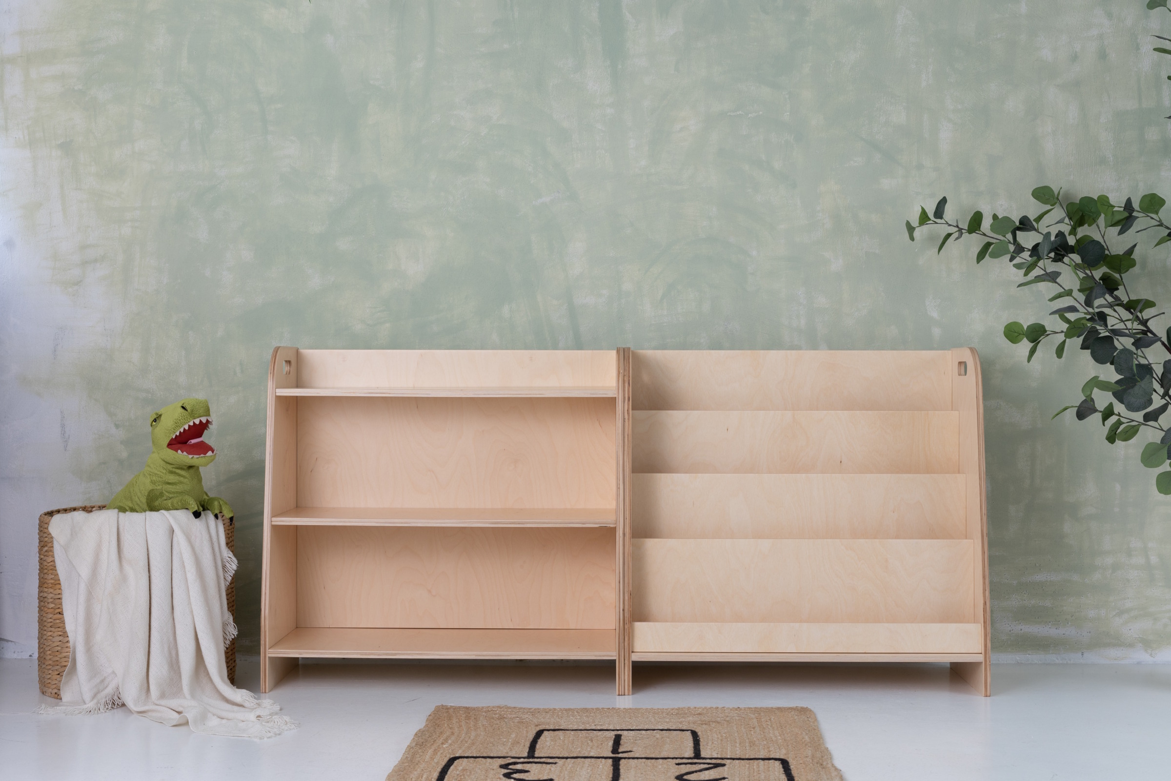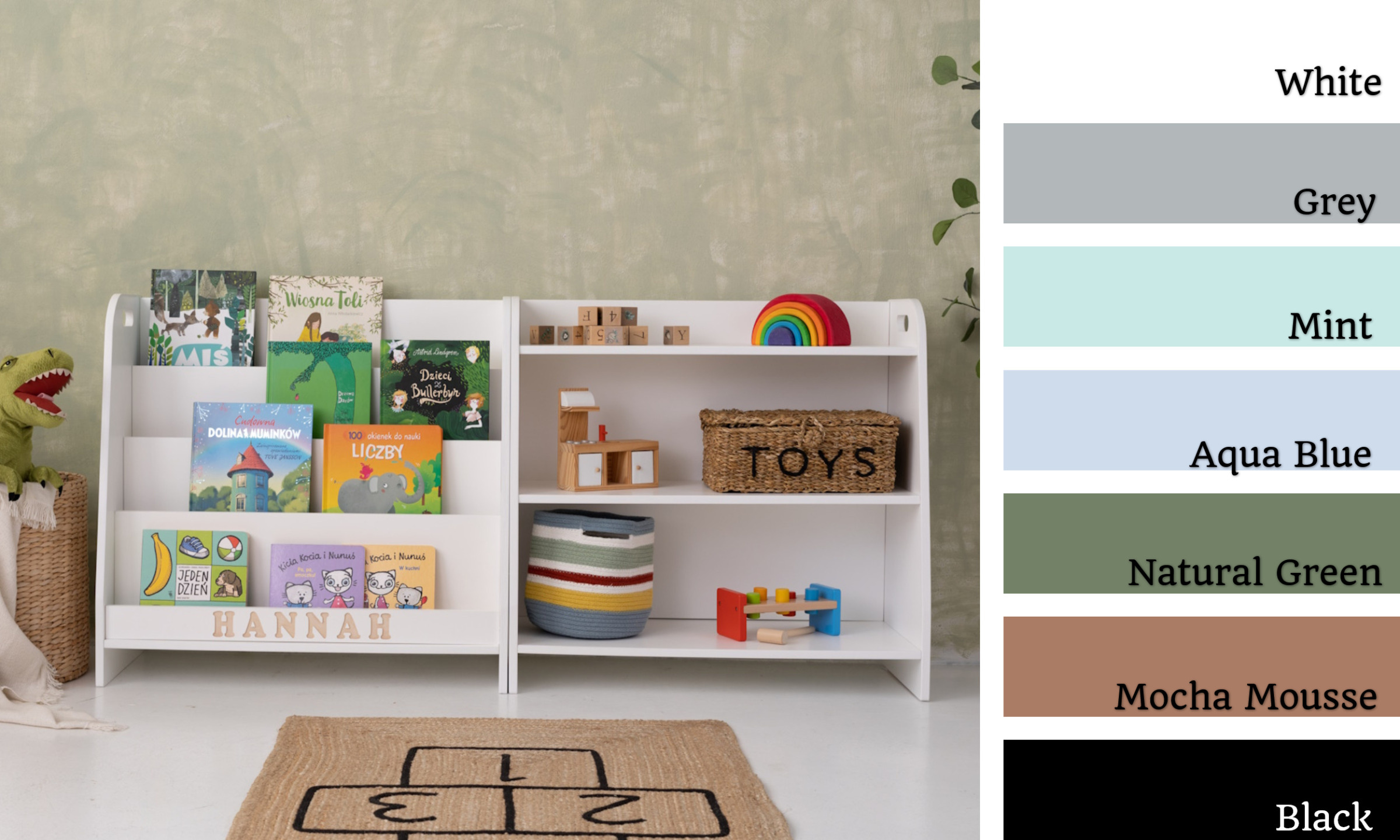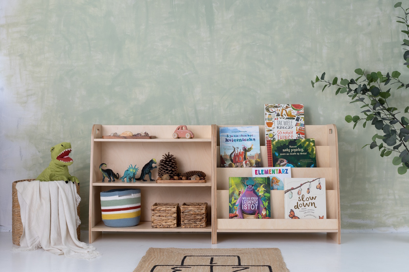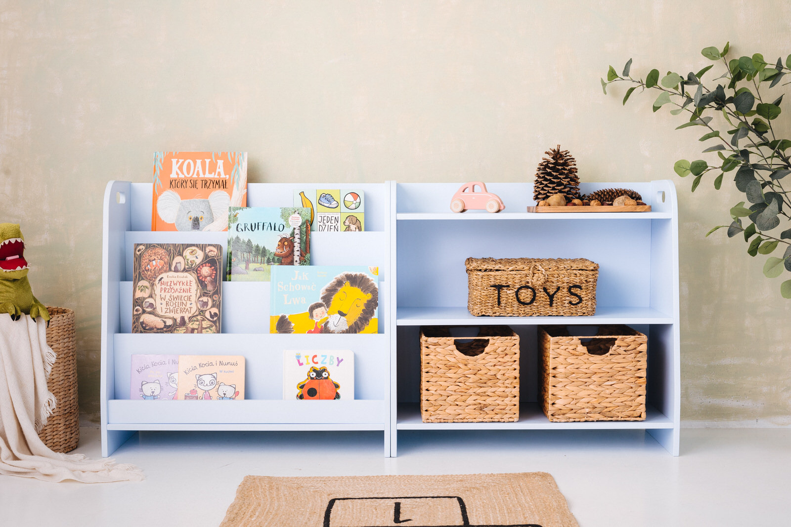 Regał na zabawki i biblioteczka zostały wykonane ręcznie ze sklejki o grubości 15mm wyprodukowanej z drewna liściastego. Pomalowano je całkowicie bezpiecznymi dla środowiska i zdrowia dziecka lakierami i farbami spełniającymi m.in. warunki europejskiej normy PN EN 71.3.